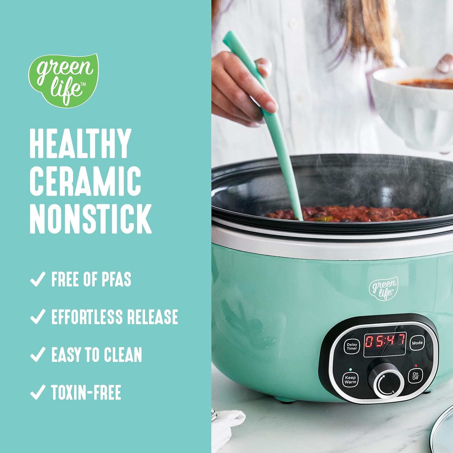 GreenLife 6 Quart Ceramic Slow Cooker, PFAS-Free, Programmable, Removable Healthy Nonstick Pot for Family Meals, Sear on Stovetop, Keep Warm, Digital Timer, Dishwasher Safe Glass Lid, Turquoise