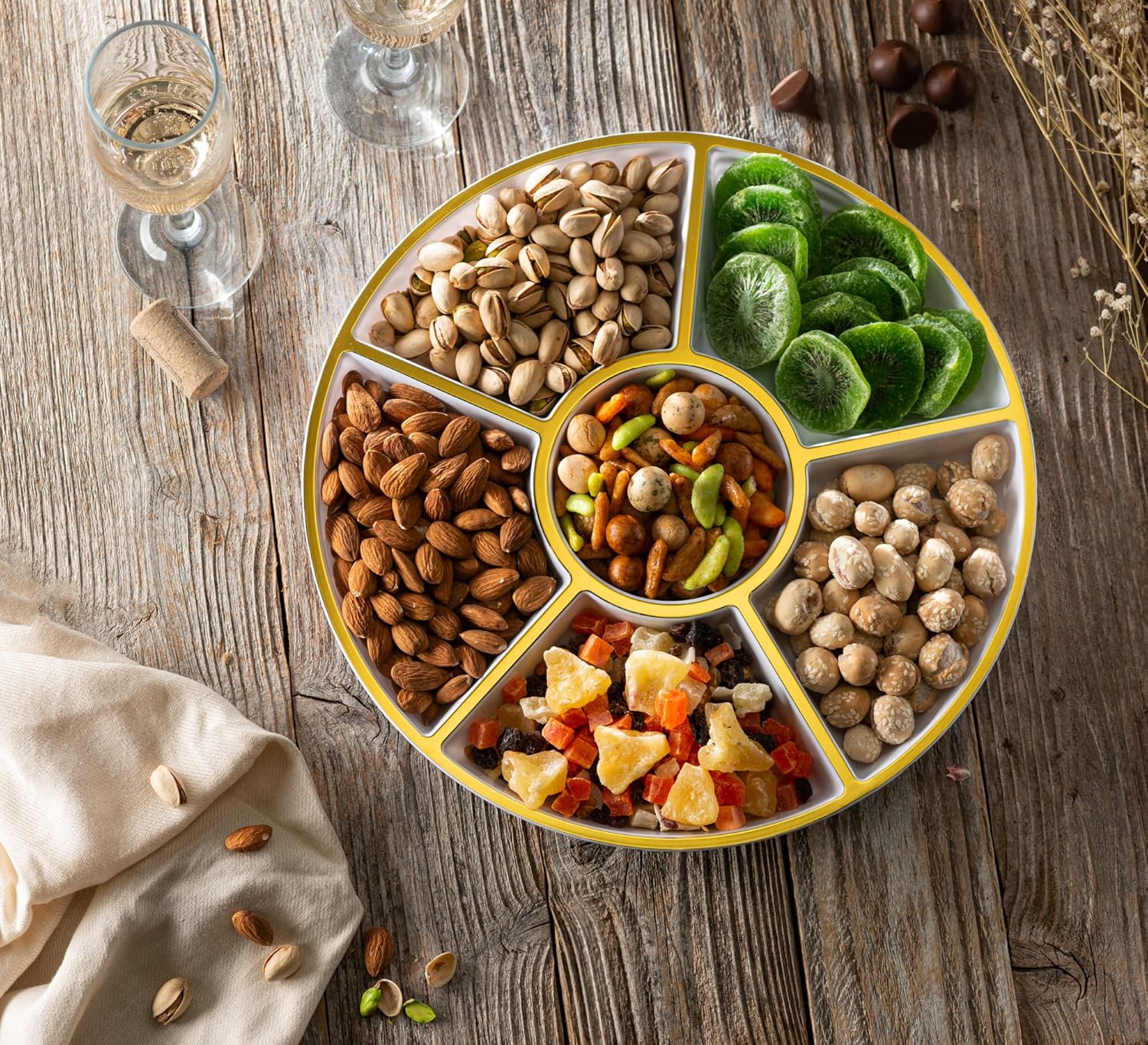 - SIZE 12” round serving plate consists of 6 divided sections with a center dip section which is excellent for serving snacks and appetizers. Its each section are amply sized for chips and salsa, veggies and dip, shrimp and cocktail sauce and much more