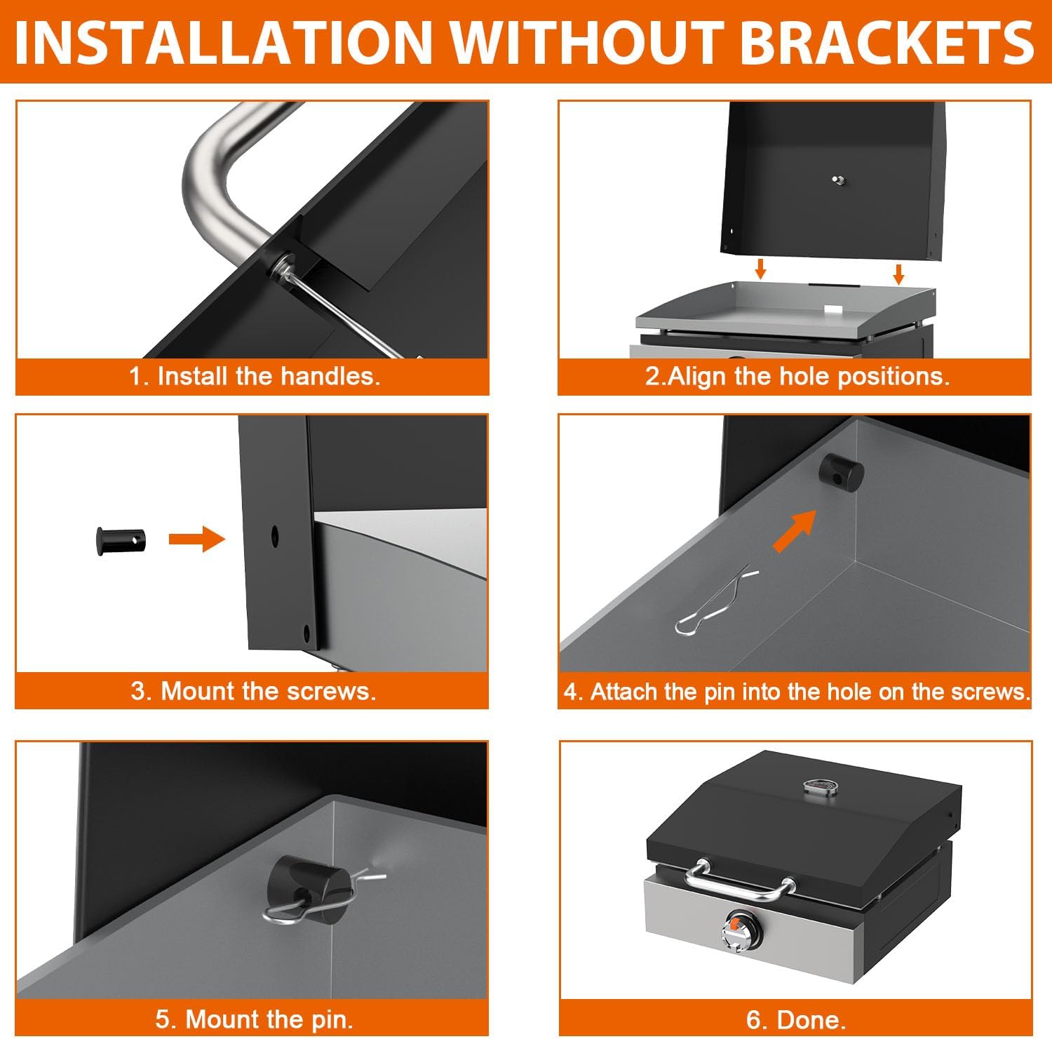 - When your griddle plate has two holes in both sides, please use black short screws and cotter pins to mount the hard cover with the griddle plate directly. 【Note】Do not need to use the brackets in this way.