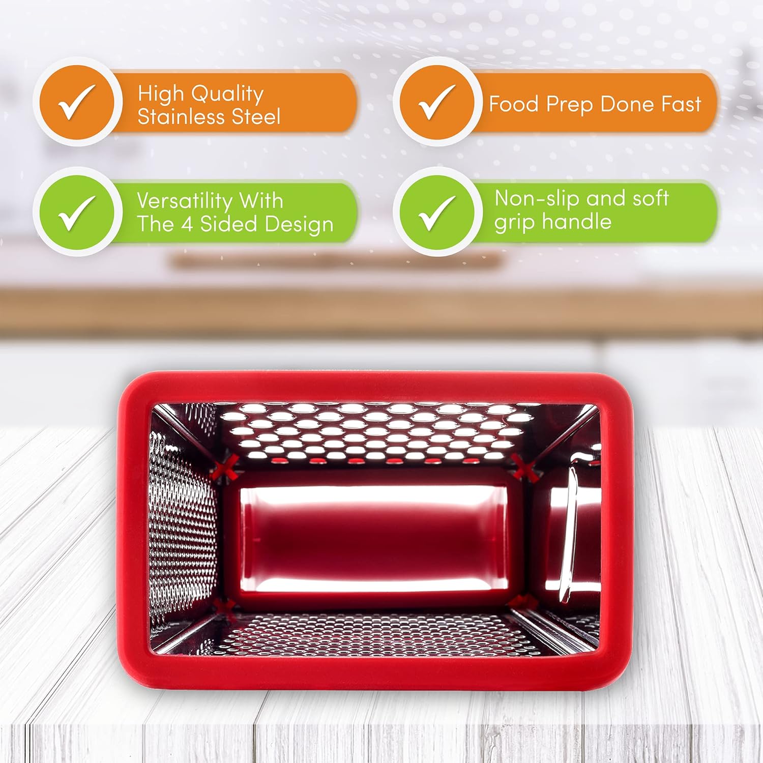Spring Chef Professional Red 10" Parmesan Cheese Grater With Container, Stainless Steel & Soft Grip Handle, 4 Sided Kitchen Carrot Shredder, Handheld Box Grater for Potato, Veggie, Ginger, Hashbrown