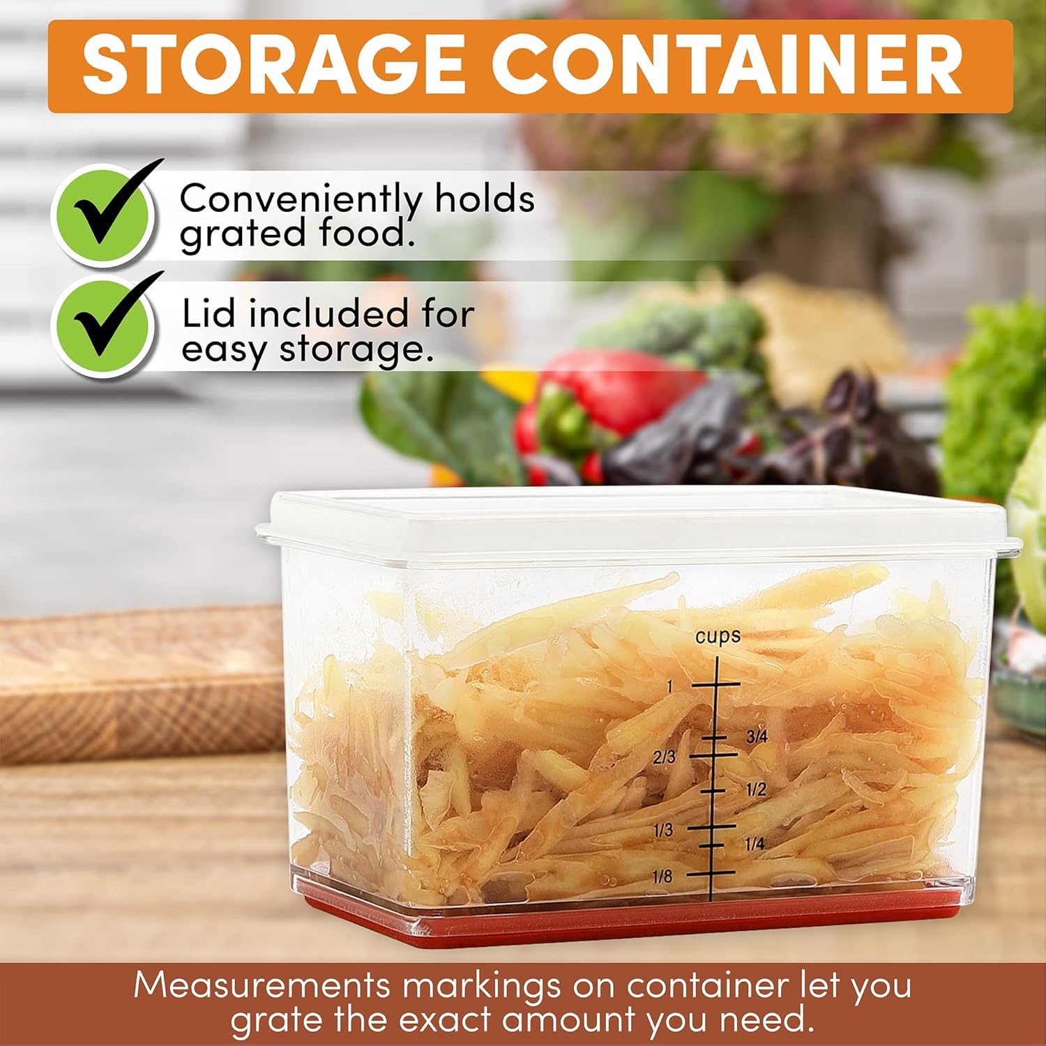 - Included Storage Container With Lid: The included storage box lets you grate directly into the container and store it with the lid. The container also has measurement markings on the side so you can get the perfect amount.