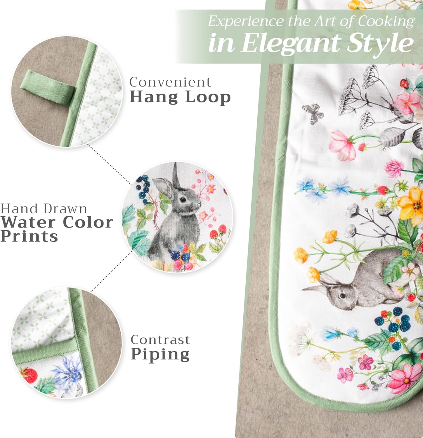 - Package includes: Includes 1 double oven mitt sized 7"x35". Perfect for handling hot cookware safely while adding a touch of European elegance to your kitchen. Designed in Europe and made in India with care