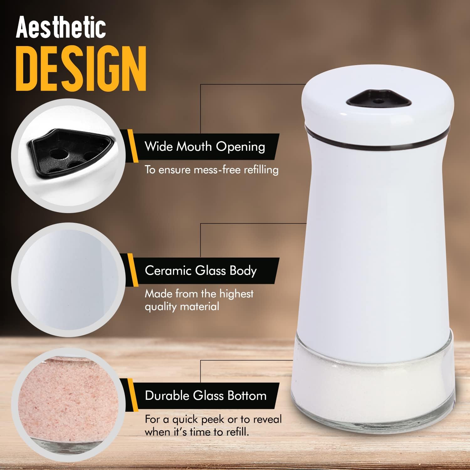 - SLEEK AND CLASSIC DESIGN: The salt shakers have a perfect sheen with the combo glass and stainless steel. Designed for the modern home with perfect functionality - exposed glass bottom lets you know which spice is inside and when it needs a refill.
