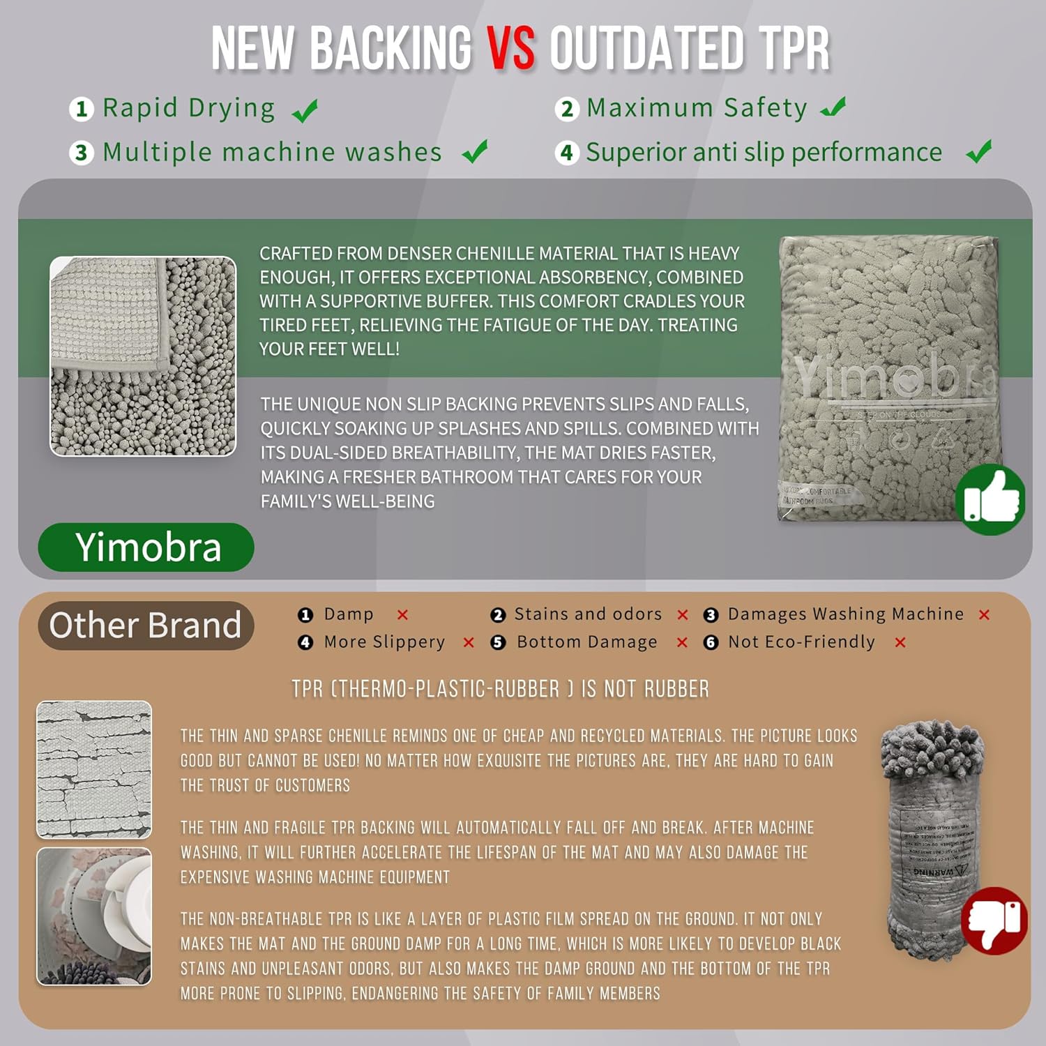 - Total Grip Safety & Quick Dry: Yimobra bath rug features a feather-light yet ultra-grippy hot-melt backing that stays firmly in place on wet surfaces. Its vertical air-channel chenille fibers ensure rapid and complete dryness, providing instant dry safety the moment you step out of the shower. The product is tested for harmful substances, performance, longevity, and emissions in accordance with the OEKO-TEX Standard 100