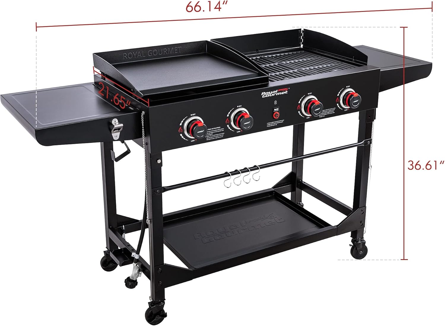 Royal Gourmet GD402 4-Burner Propane Gas Grill and Griddle Combo with Foldable Legs, 48,000 BTUs, Portable Griddle Grill Combo for Outdoor Cooking While Camping or Tailgating, Black