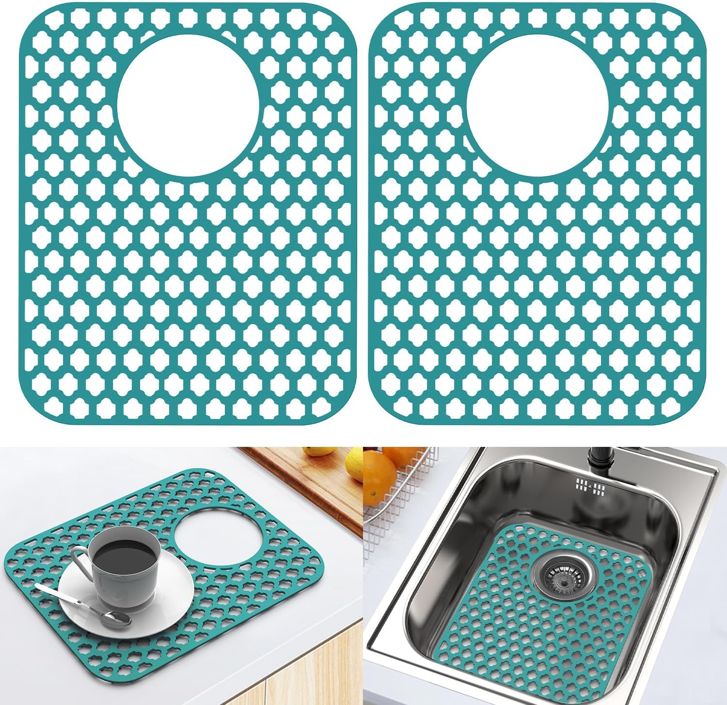 2 Pack Silicone Sink Protector for Kitchen Sink Bathroom, 13.58" x 11.6" Heat-resistant Sink Mat Non-Slip and Durable Silicone Protectors, Rear Drain, Green