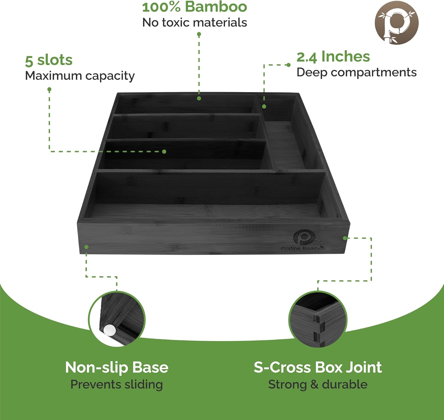 - DESIGNED WITH YOU IN MIND: This sleek and stylish drawer storage organizer is the perfect way to maximize your kitchen space. With 5 different compartments, it can accommodate all those pesky pieces that tend to get lost. The Pristine Bamboo utensil drawer organizer also features an interior depth of 2 inches with the perfect size of 13.5 x 9.8 inches.