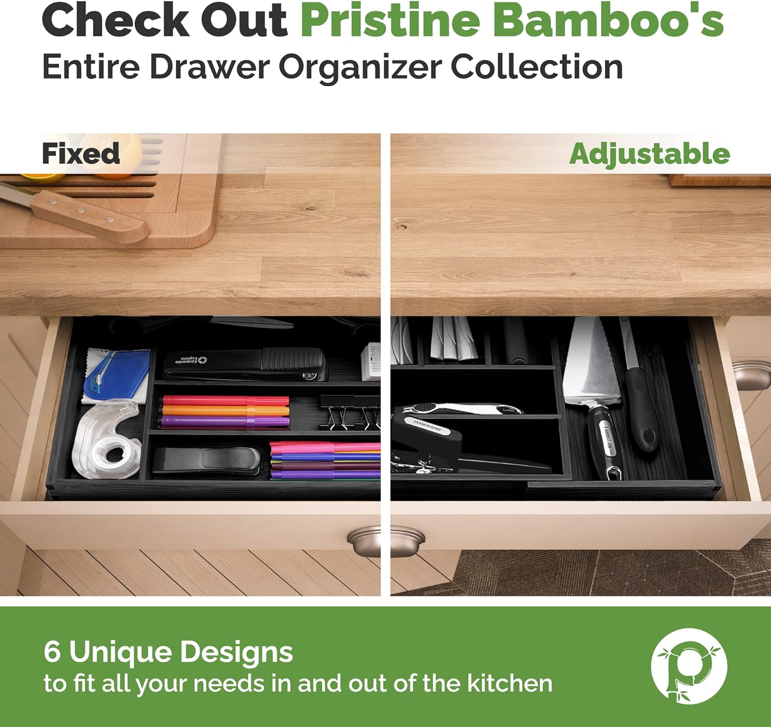 - SUPERIOR DESIGN SOLUTIONS: When you need a drawer organizer that is both beautiful and practical, there's no better option than the 10-inch Pristine Bamboo Silverware Drawer Organizer. This all-inclusive product offers 100% bamboo construction with No Toxic MDF material for strength--even its base! It also includes slip-resistant feet, so your items stay put even when moving around.