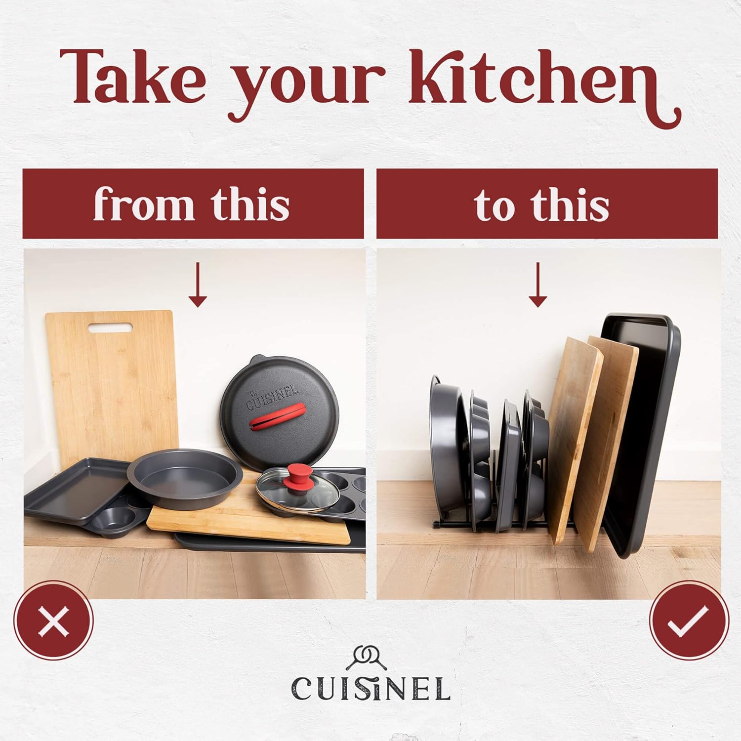 Cuisinel Lid and Dish Organizer Rack - 2-Pack Satin Nickel Kitchen Storage Organization Stand - Plate Holder, Pan/Pot Covers, Cutting Board and Cookie Sheet Divider - 7-Tier Cabinet/Counter Display