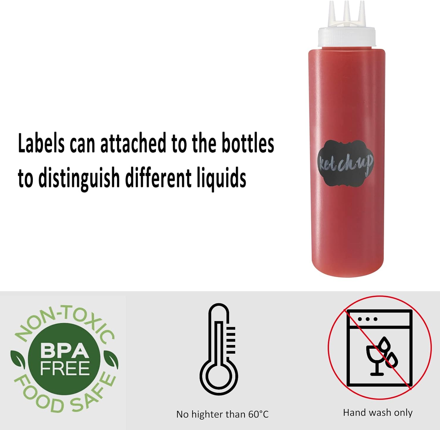 - Package Contains: 4 pack of 32oz (100ml) 3-Hole squeezable squirting bottles with extra 8 Chalk Labels, 1 Pen.