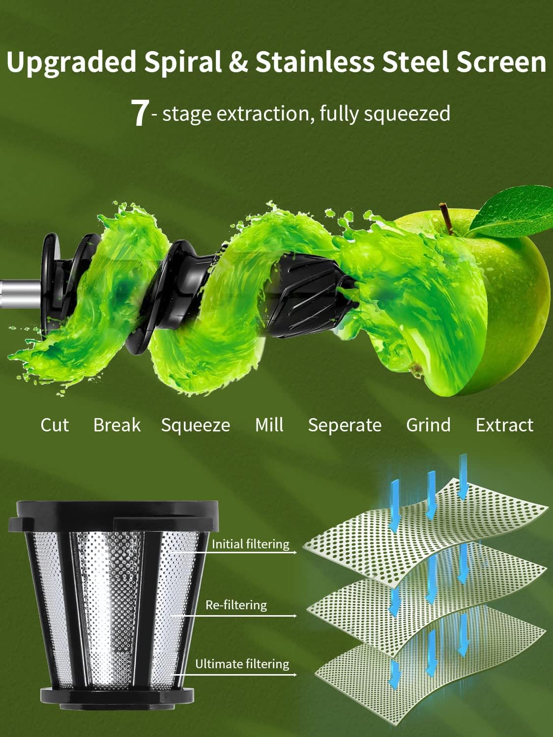 - 【The Most Ideal for Fresh Juice&Personal Health】Unlike centrifugal juicers, the masticating juicers rotates at slow speeds (under 80 pm) and efficient power (200 watts), using 7-segment spiral system and fine filter, it can fully grind fruits and vegetables to extract the most juice while reduct oxidation. Thanks to cold press process, it creates no heat, much quieter. *Retain More Nutrients and Flavors In the Juice.