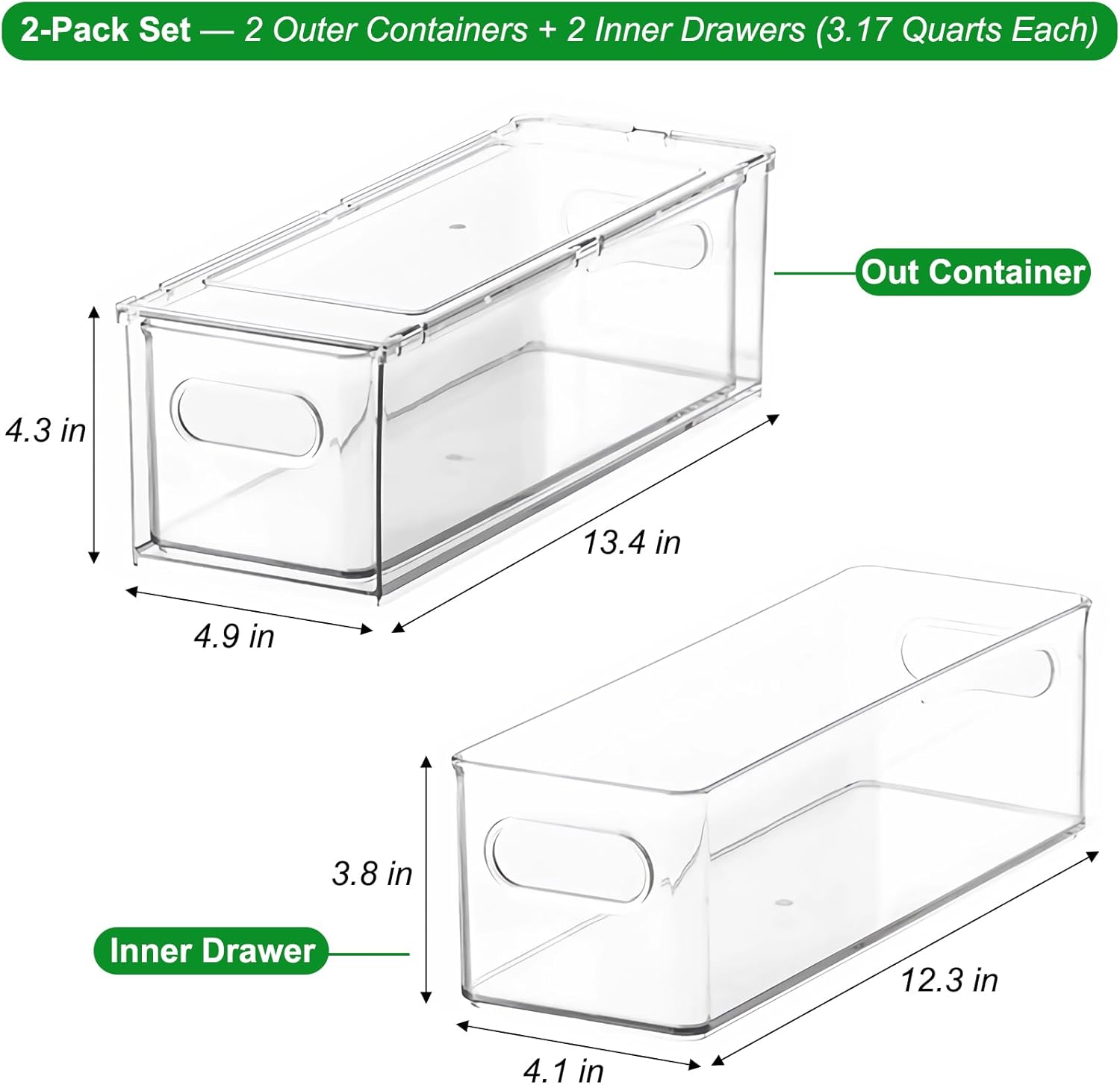 Taiuloo 2 Pack Stackable Refrigerator Organizer Bins with Pull-Out Drawer, Clear BPA-Free Food Storage Containers for Fridge Freezer, Kitchen Pantry Cabinet & Bathroom Vanity Organization