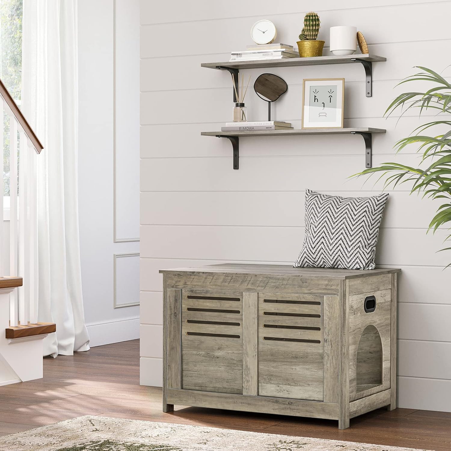 DINZI LVJ Long Wall Shelves, 31.5 Inch Wall Mounted Shelves Set of 2, Easy-to-Install, Wall Storage Ledges with Sturdy Metal Brackets for Living Room, Bathroom, Bedroom, Kitchen, Gray Wash