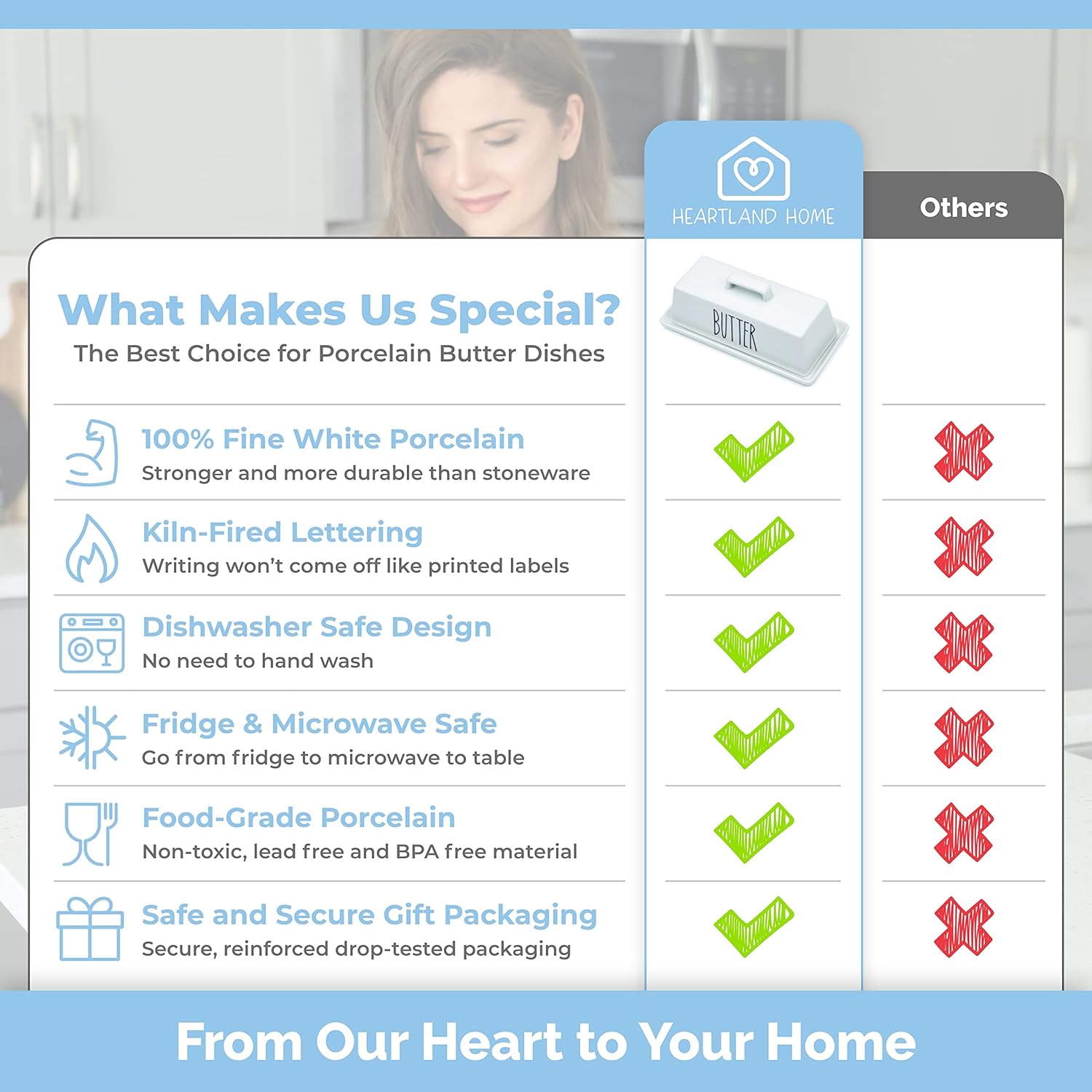 - Gift Boxed: A thick quality porcelain butter dish with sharp lettering and beautifully gift boxed. This butter saver is an easy choice for Housewarming Gifts, Christmas Presents, Birthday Gifts or Wedding Gifts. Give your sticks of butter a nicer home, with a porcelain butter stick holder from Heartland Home.