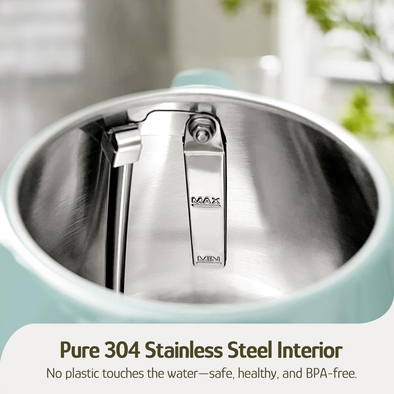 - ăAll Stainless Steelă- This retro electric kettle is crafted with food-grade 304 stainless steel in its interior, lid, and filter. It has no plastic in contact with the water, providing you and your family with BPA-free healthy drinking.