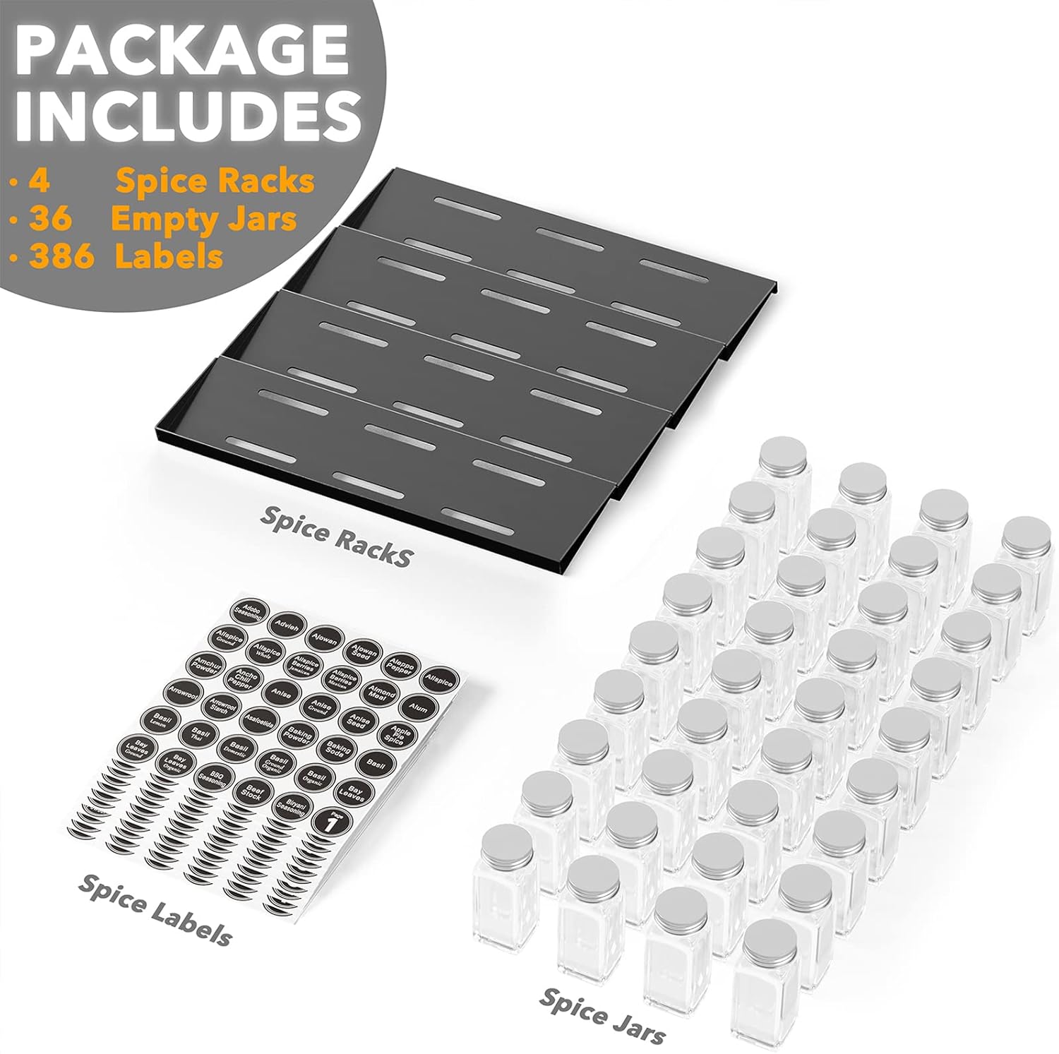 - Complete Drawer Spice Organizer Set: 1 x Drawer Spice Rack, 36 x Square Empty Glass Spice Jars, 386 Spice labels