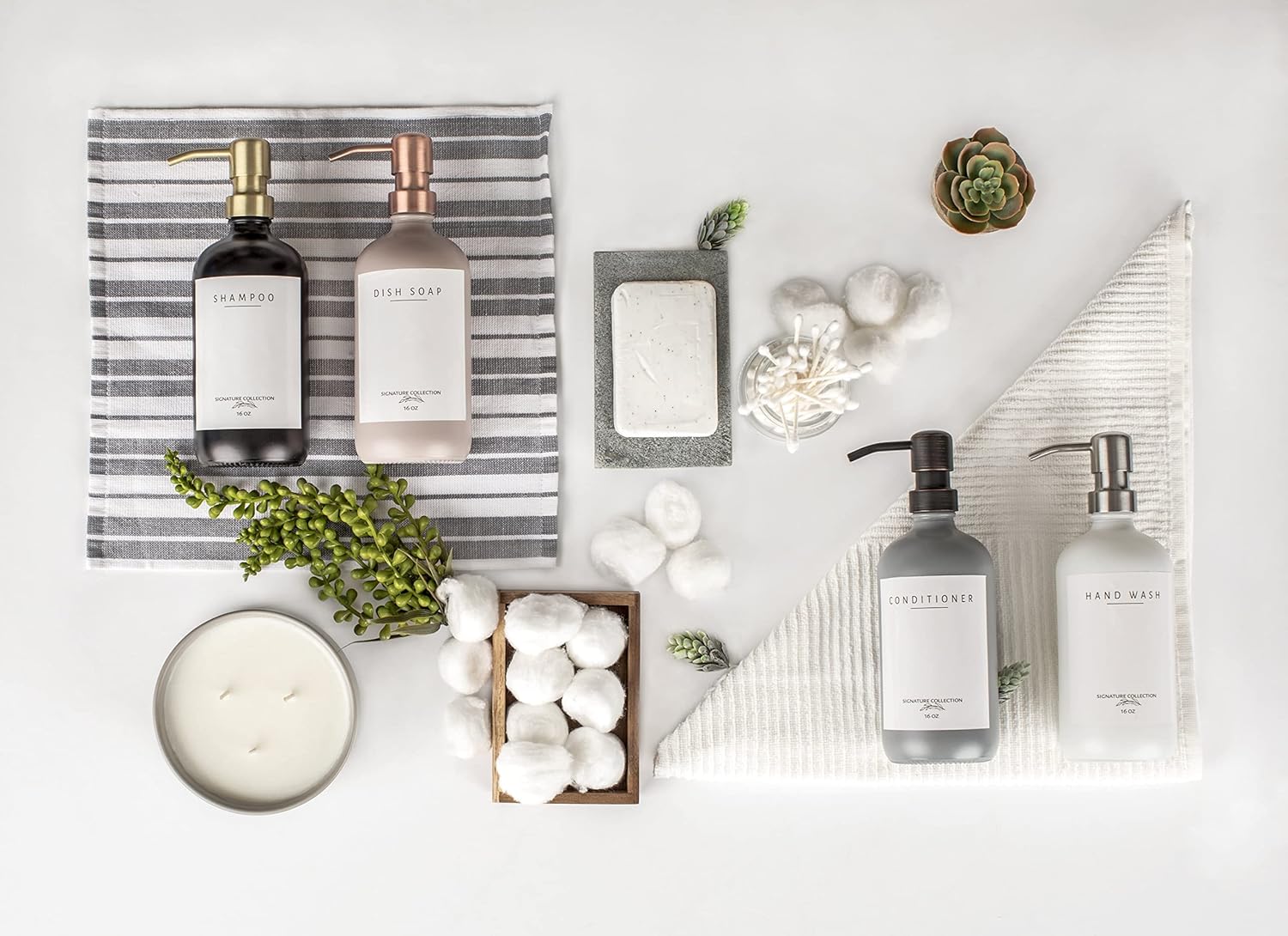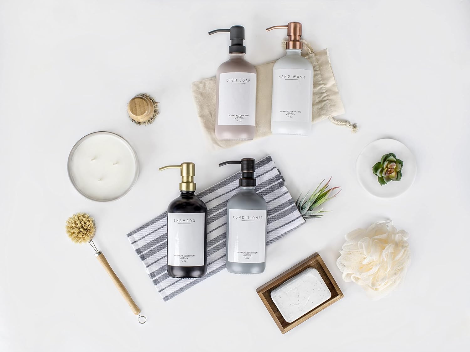 - ✅ 5 WATERPROOF LABELS: Now with 5 stickers, it's your choice to use the Kitchen Soap Dispenser Set with Dish Soap for hand soap, dish wash, lotion, conditioner, or shampoo. To clean the lotion dispenser set for the bathroom and kitchen sink soap dispenser set, just run the bottle under water and watch any residue simply wash off. With our exclusive no-leak pump, the bottle enables you to put out a good amount of soap with a single pump.
