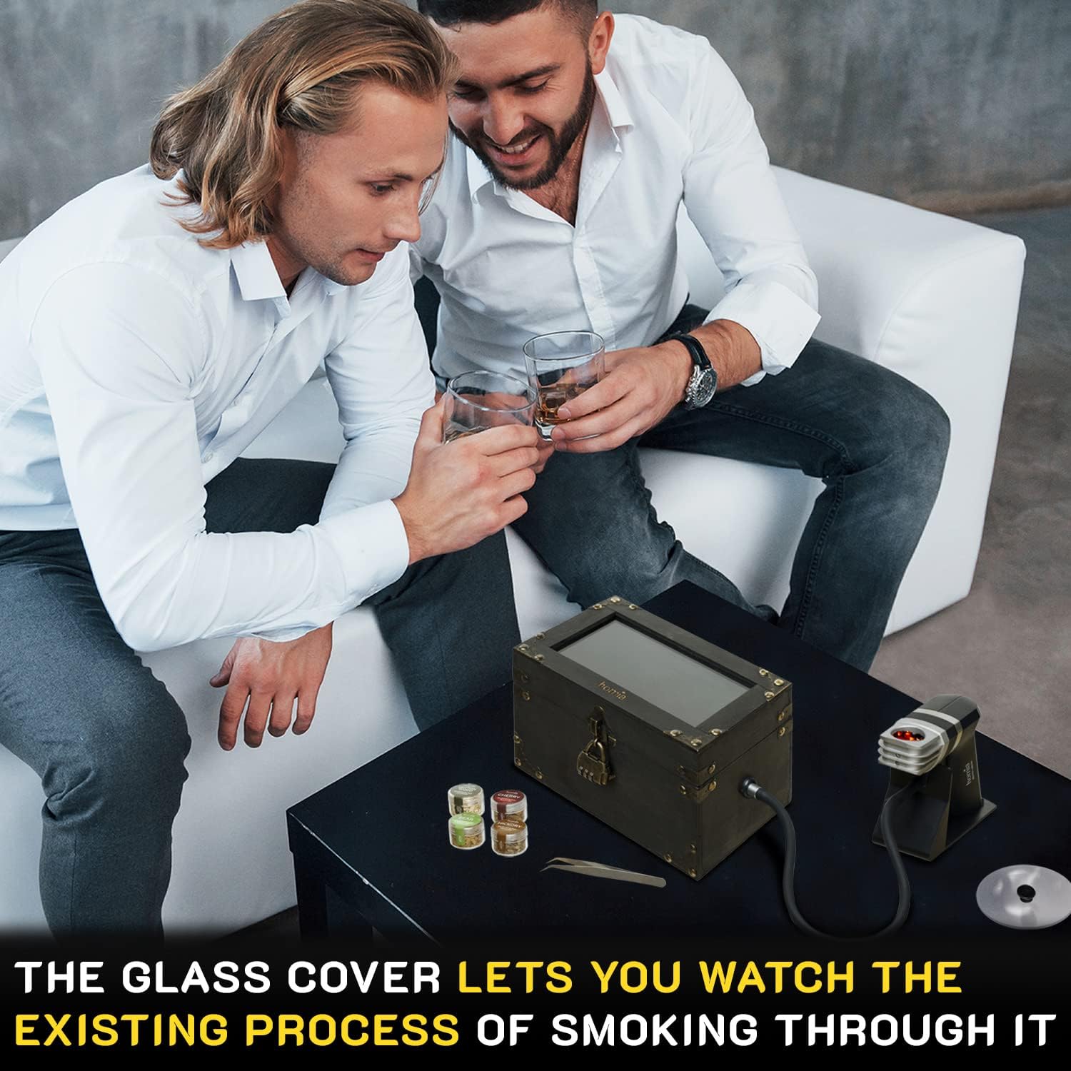 - 👍EASY TO USE – Ergonomic Design perfectly fits in hand and a wide burn chamber helps to fast lighting Wood Chips. Whiskey Smoker will produce cold smoke and apply a delightful flavor to your Whiskey or Cocktails, grilled or sous vide meat, cheese. OPERATION LOCK - this unique feature gives you and your guests a lot of fun. Make your favorite cocktail, lock it, and let your guests earn their cocktail by solving the code. It will become your favorite Cocktail Smoker and the best gift for men