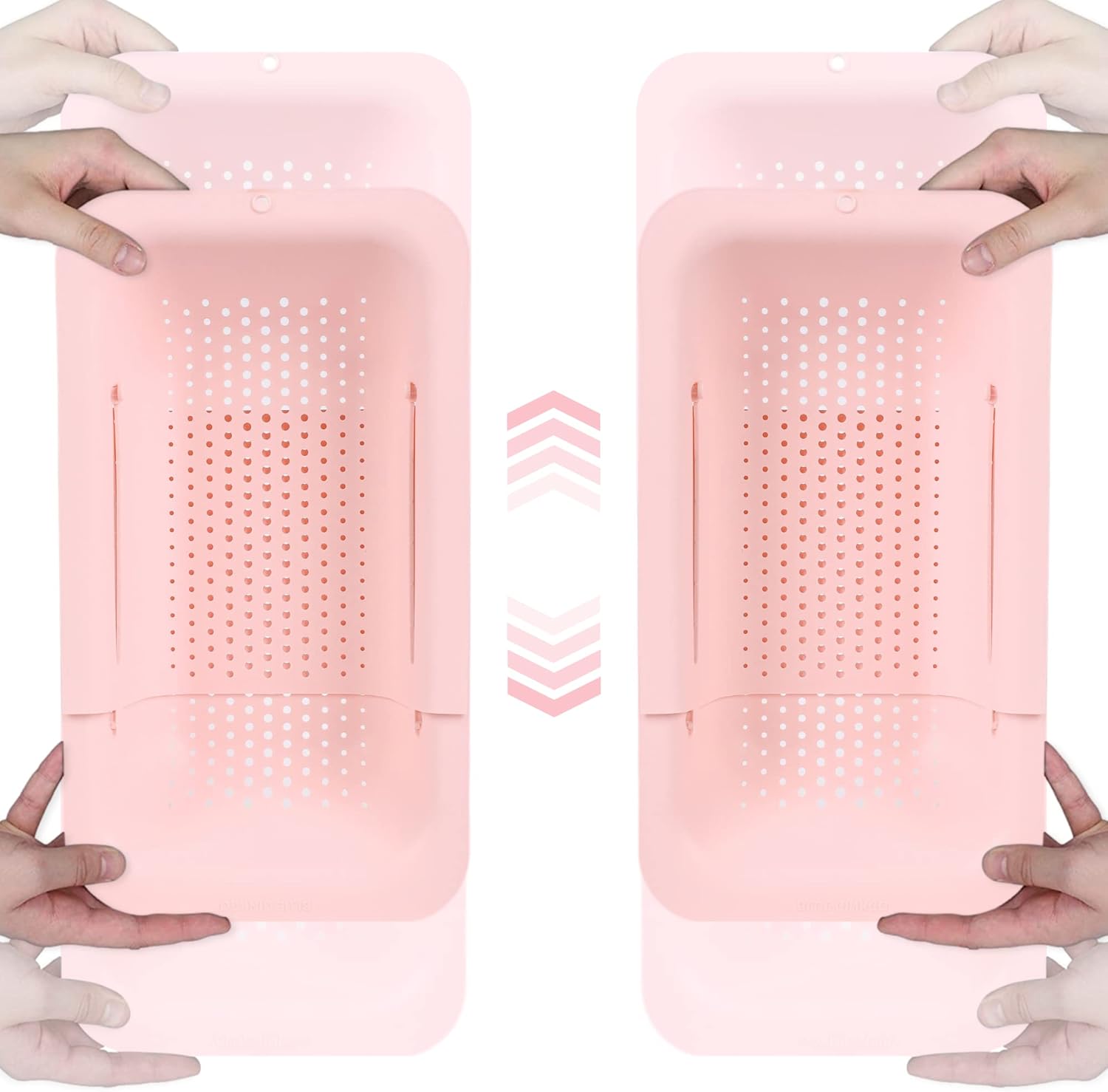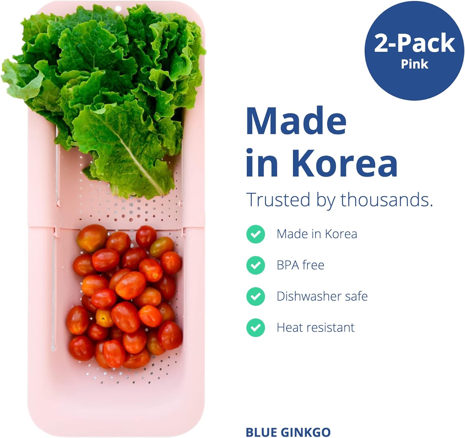 BLUE GINKGO Sink Colander Baskets - (Pack of 2) Wash Vegetables and Fruits, Drain Cooked Pasta and Dry Dishes - Extendable - New Home Kitchen Essentials (2 Pink)