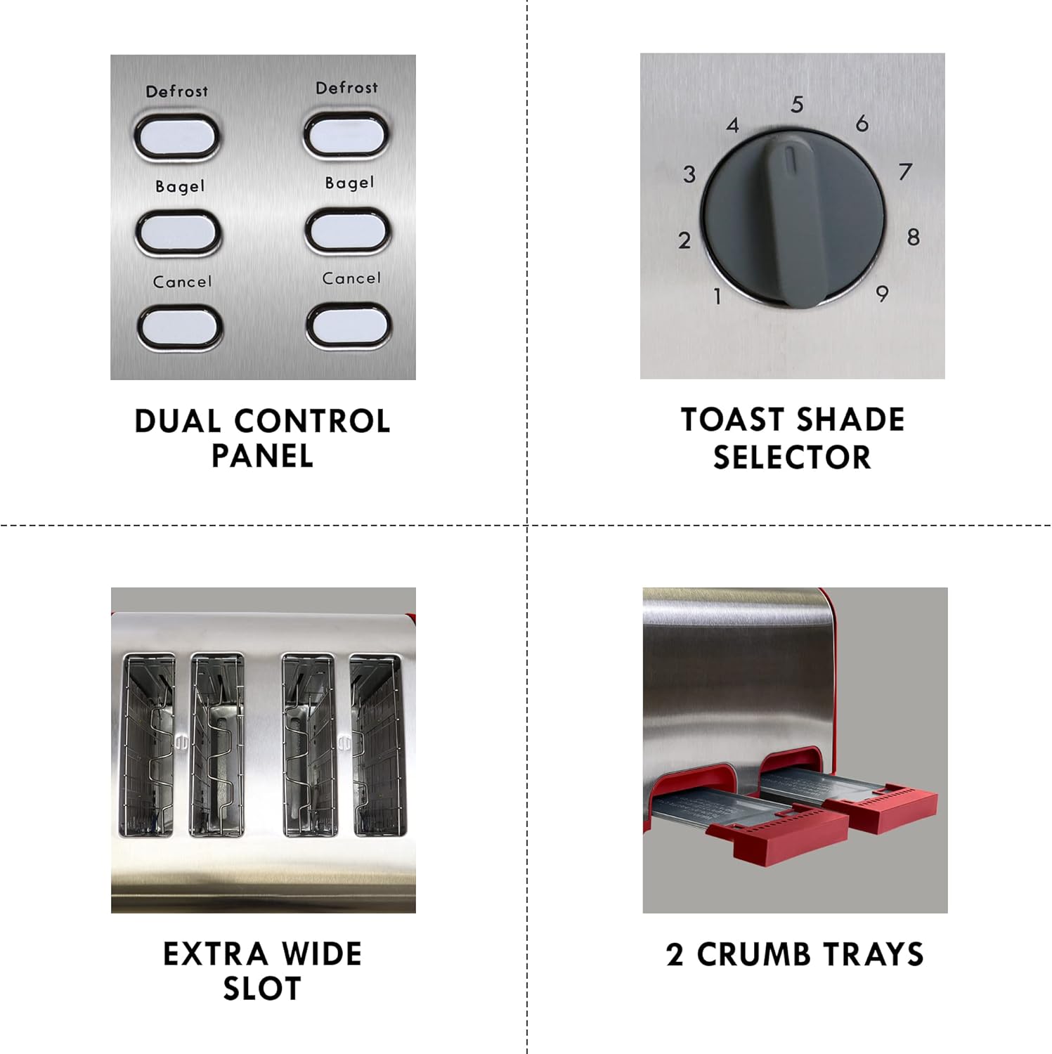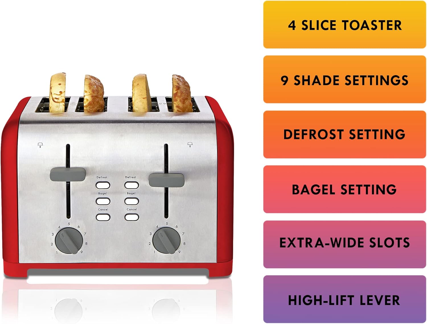 Kenmore Toaster 4 Slice - Extra Wide Slot Countertop Kitchen Appliance, Defrost Function, Grille-Pain, 9 Shade Settings, Compact Design, Easy Clean Crumb Tray, Bread Bagel, Stainless Steel & Red