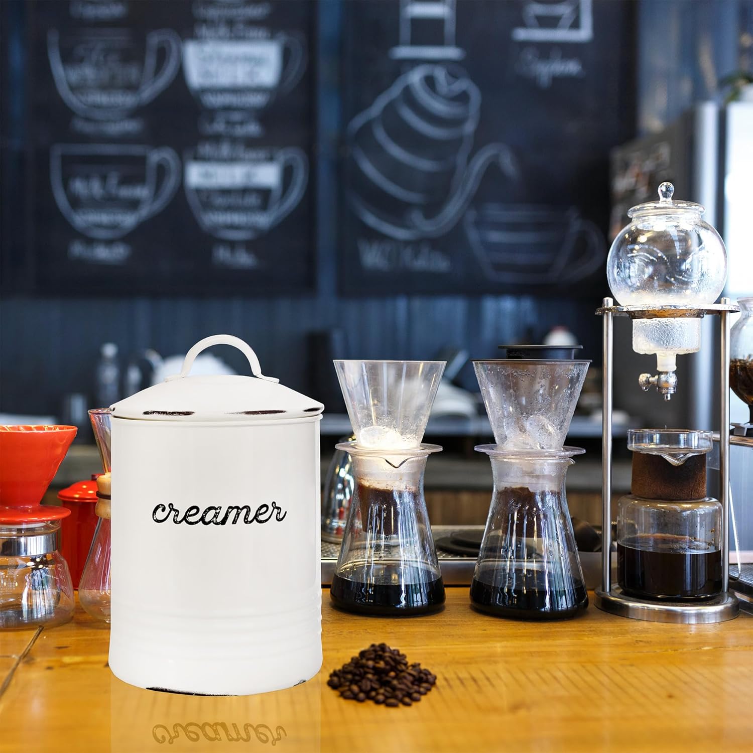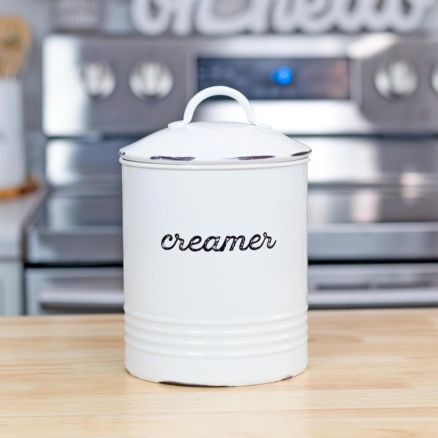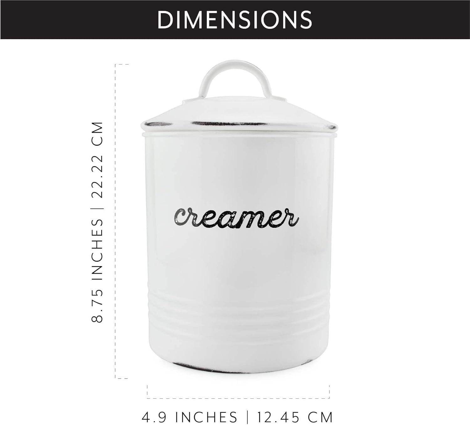 AuldHome Design Enamelware White Creamer Canister; Rustic Distressed Style Coffee Accessory Storage for Kitchen