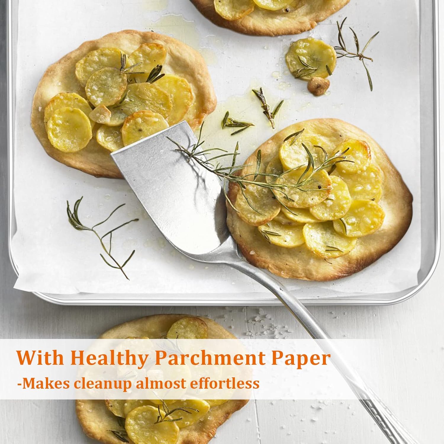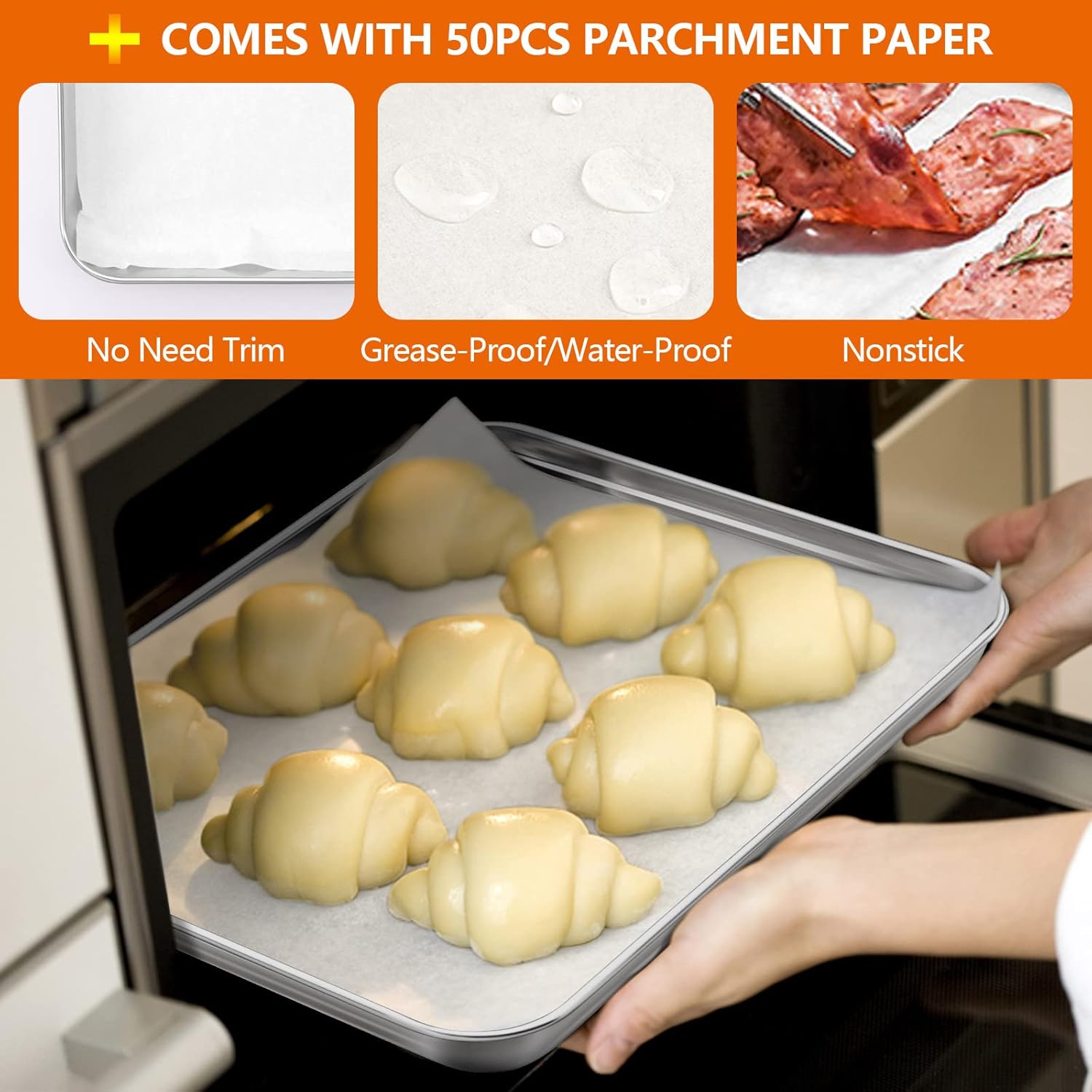 - 【GREAT VALUE WITH PARCHMENT PAPER】Comes with 50pcs grease-proof/water-proof natural wood pulp parchment paper, Helps prevent sticking and easy release foods, Great for broiling and roasting anything from small layered sheet cake, pizza to vegetables, Great value to replace your old bakeware or as a gift for someone