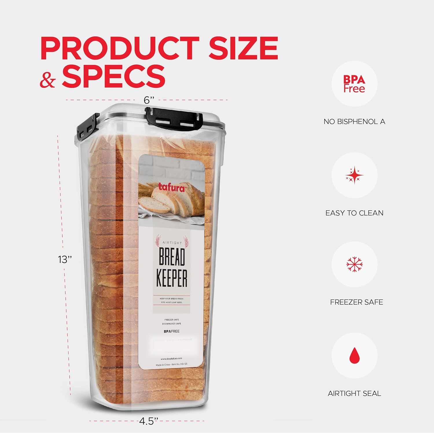 Tafura Bread Container - 5.8 Liter BPA Free Plastic Bread Box - Container/Holder for Homemade Loaves and Baked Goods with Black Airtight Lid
