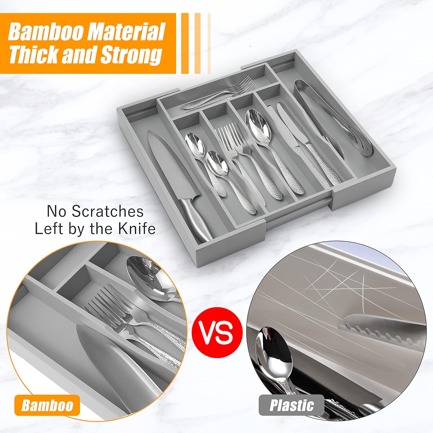 - â ăFit your drawer perfectlyăStill measuring every kitchen drawer and buying a kitchen drawer organizer of the same size? Our bamboo silverware drawer organizer is designed with 5-7 compartments. Thanks to its adjustable features, our expandable drawer organizer can be expanded from 10 to 15 inch wide, Perfect for any kitchen drawers.