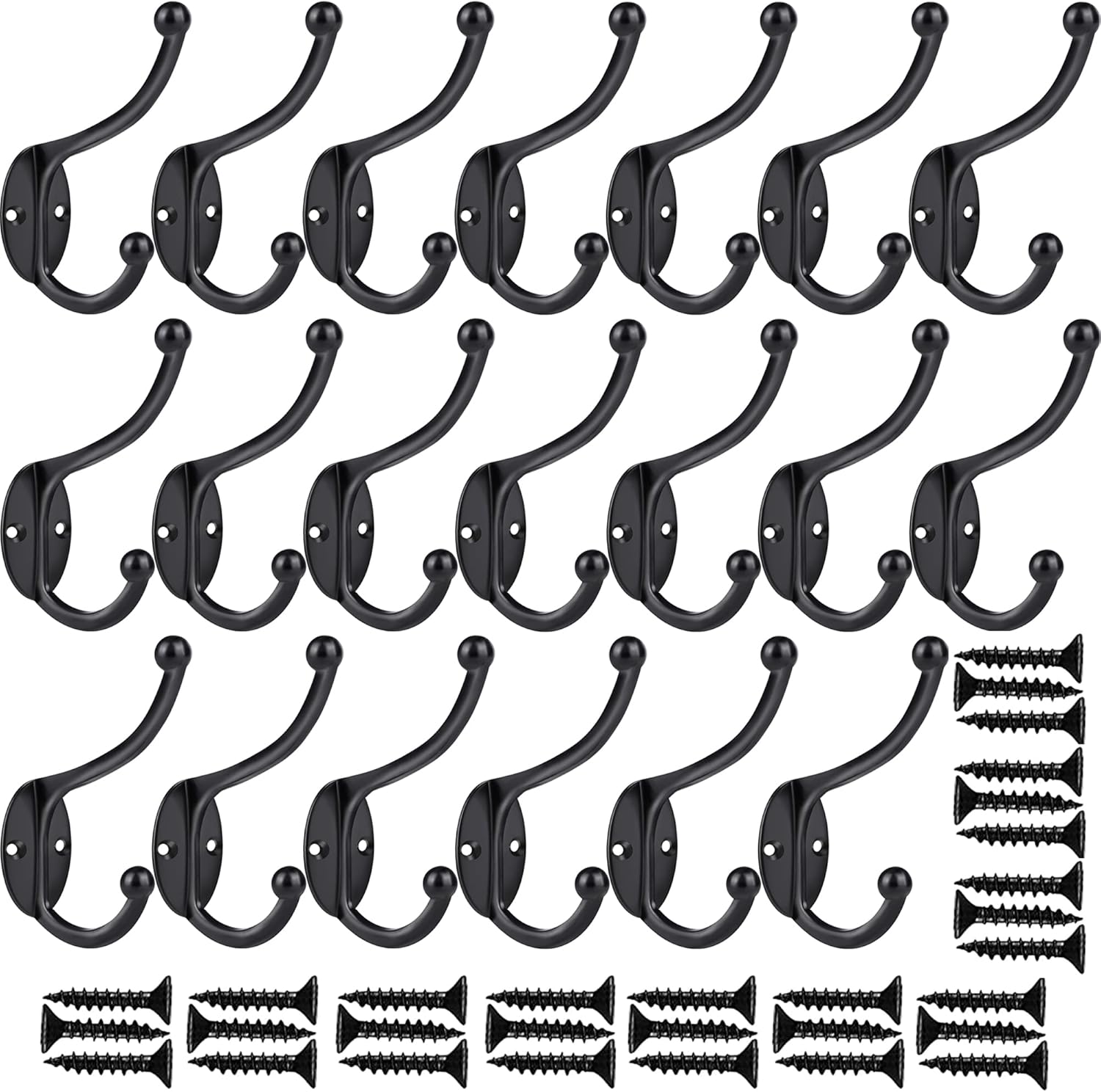 ZEYU 20Pcs Wall Hooks, Coat Hooks Hardware Heavy Duty Hooks for Hanging Coats Double No Rust Black Hook Wall Mounted with Screws for Key, Towel, Bags, Cup, Hat