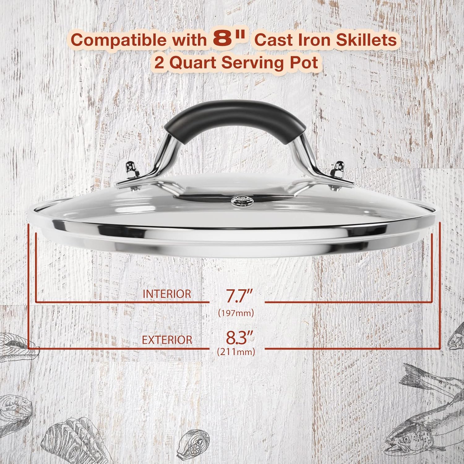 8 Inch Tempered Glass Lid Compatible with 8" Lodge Cast Iron Skillet and 2 Quart Serving Pots