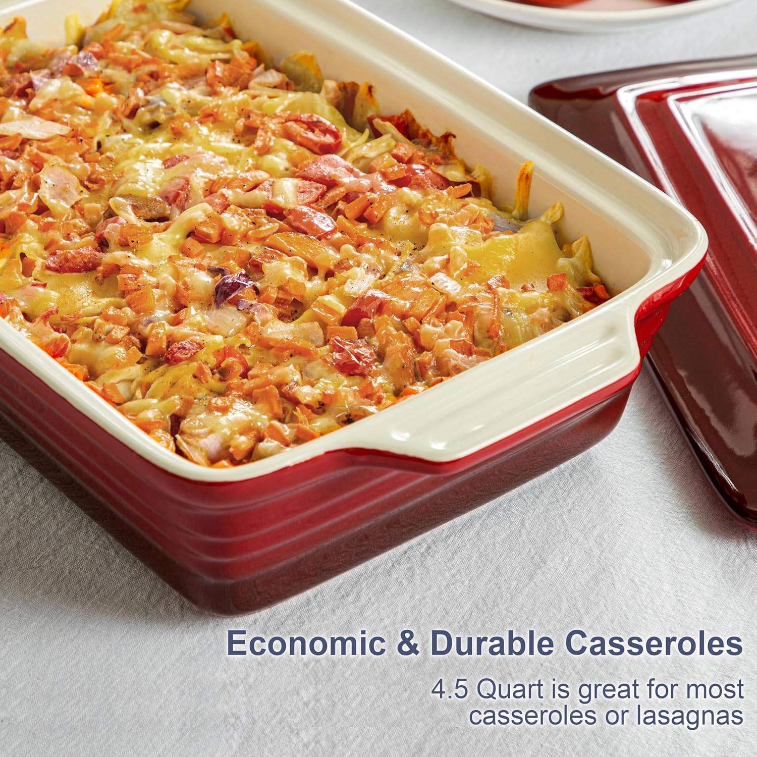 - 【4.5-Quart Versatile Bake & Serve】LOVECASA’s 9x13 inch ceramic casserole dish with lid (4.5-quart capacity) is designed for baking, roasting, and serving in one elegant vessel. Perfect for lasagna, casseroles, roasted meats, vegetables, cakes, and more. Its deep rectangular shape prevents overflow, while the secure lid locks in moisture for tender, flavorful dishes