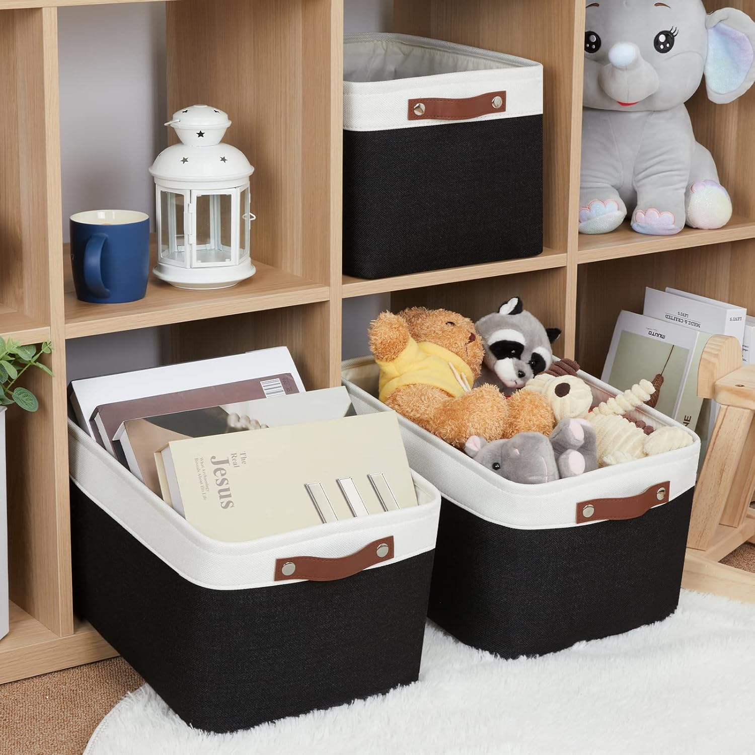 - 【HNZIGE Exclusive Fabric Storage Bins Set】Set includes 3 fabric large baskets(15" x 11" x 9.5"). There are leather handles on both sides, perfect for use as black decorative storage baskets. These fabric storage baskets for shelves are a new and exclusive design for keeping clothes and household items in the order