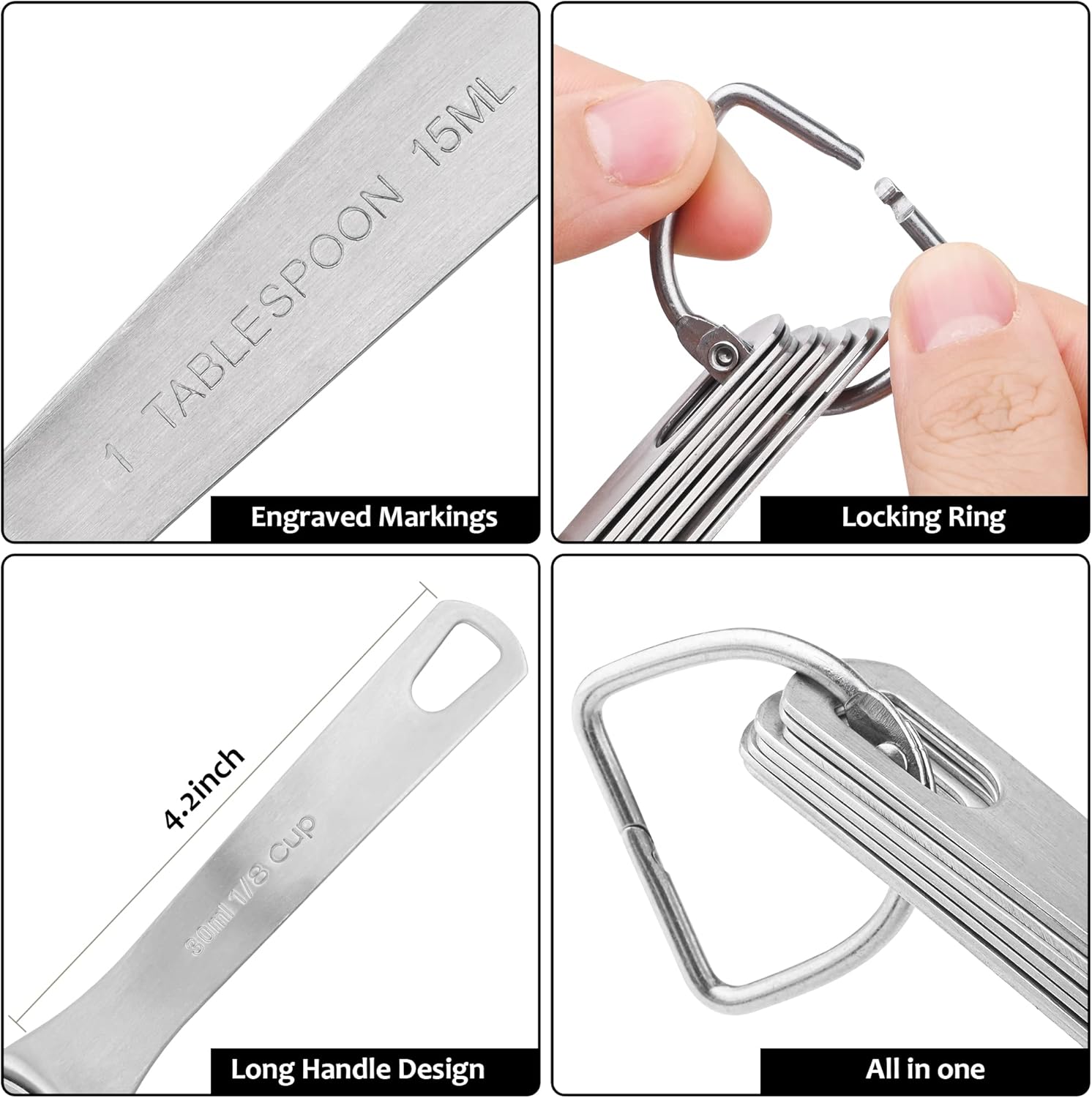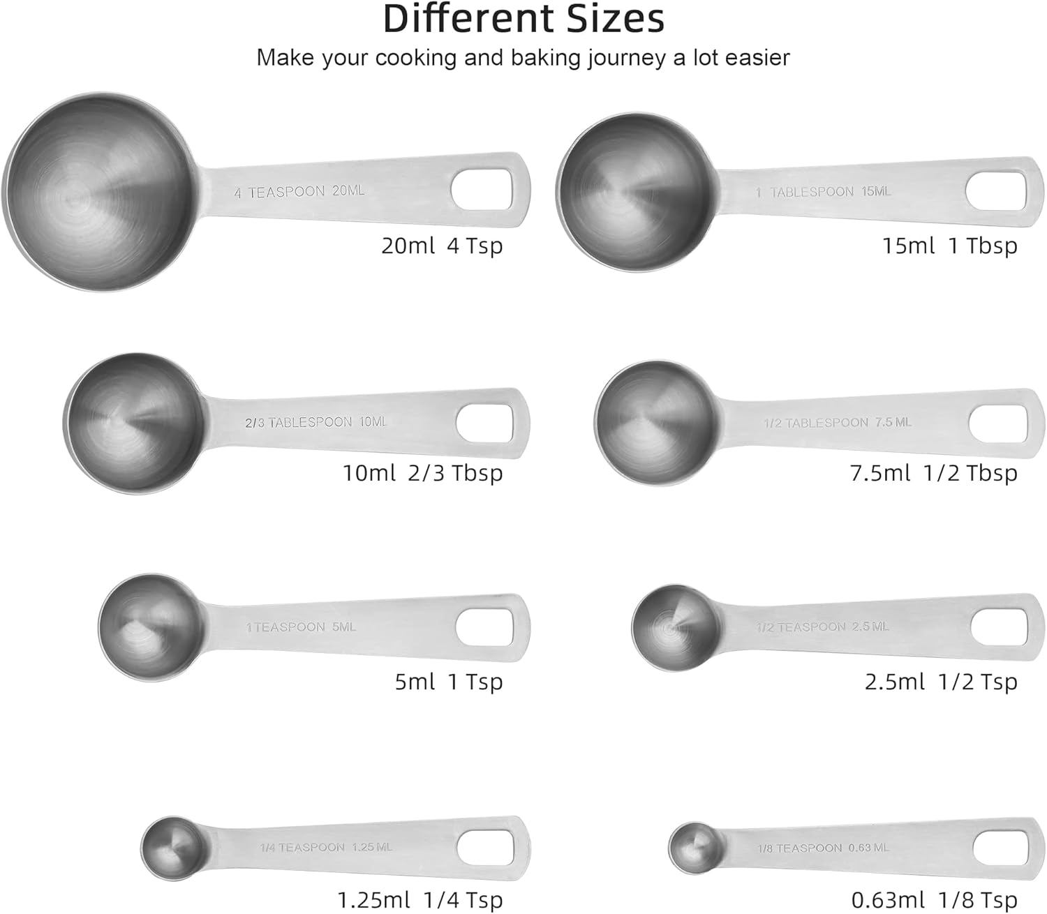- MANY SPECIFICATIONS- 7 Measuring Cups ( 1/8, 1/4, 1/3, 1/2, 2/3,3/4, 1cup ) and 8 Spoons (1/8, 1/4, 1/2, 1 tsp, 1/2, 2/3, 1tbsp, 4tsp ), 1 Leveler and 2 Rings to meet all your needs for Baking .