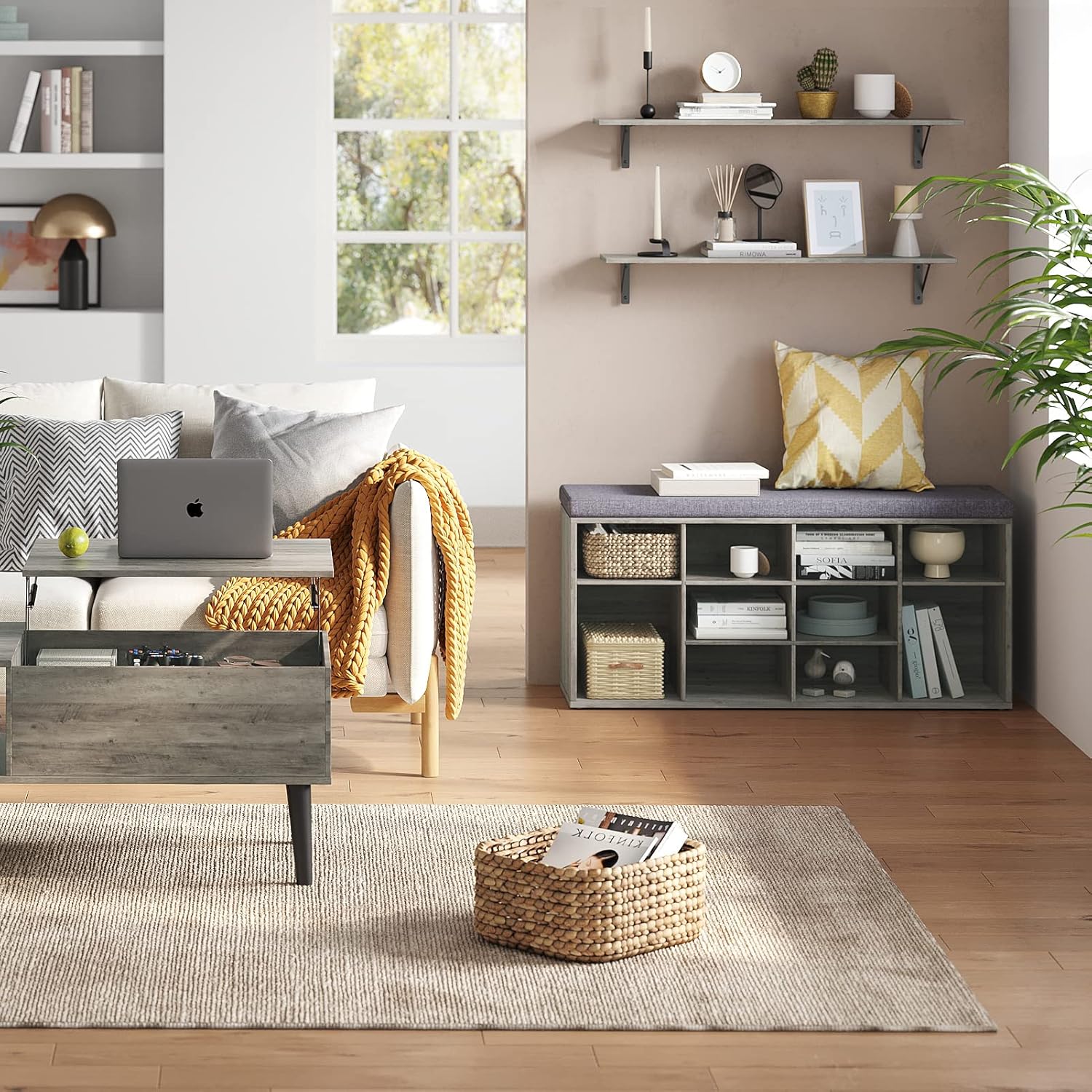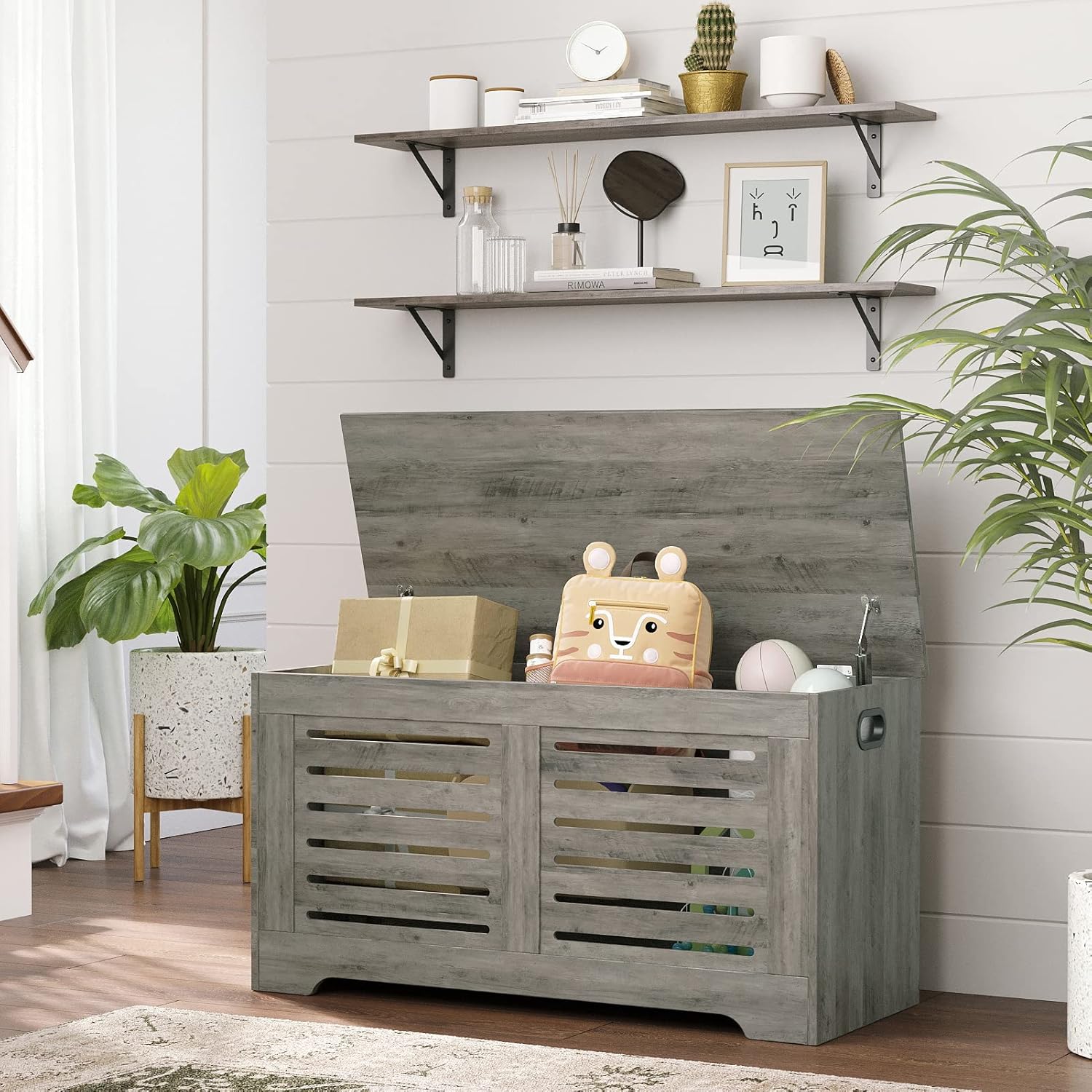 - ăBeautify Your HomeăElegant grey wash color complements tough lines, rusticity wood grain and industrial design add a classic and stylish vibe to your home. A perfect combination of wood and iron, bringing you a cozy life easily by placing some decorations. Matches with any wall perfectly