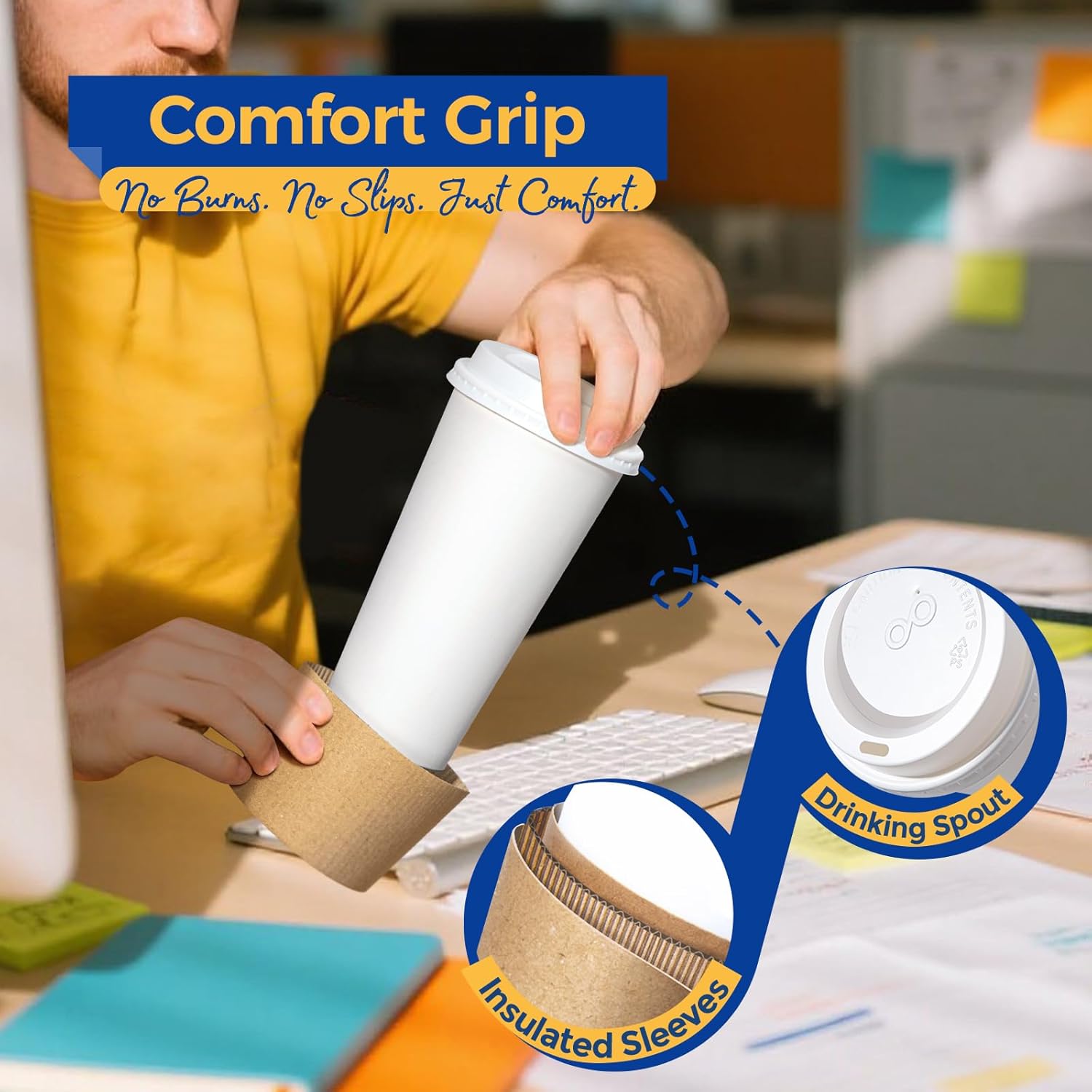- Ideal Hot Cups with Lids: Enjoy a spill-free experience with secure lids that retain beverage temperature. Each disposable coffee cup has a rolled rim for smooth, leak-free sipping and an insulated sleeve to keep your hands comfortably protected.