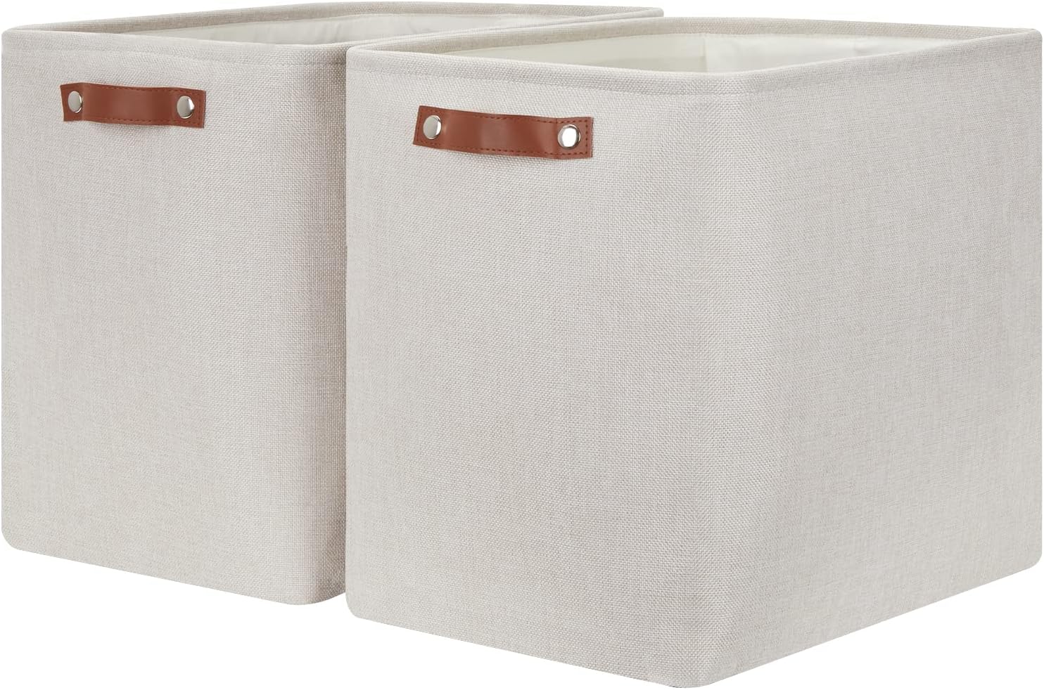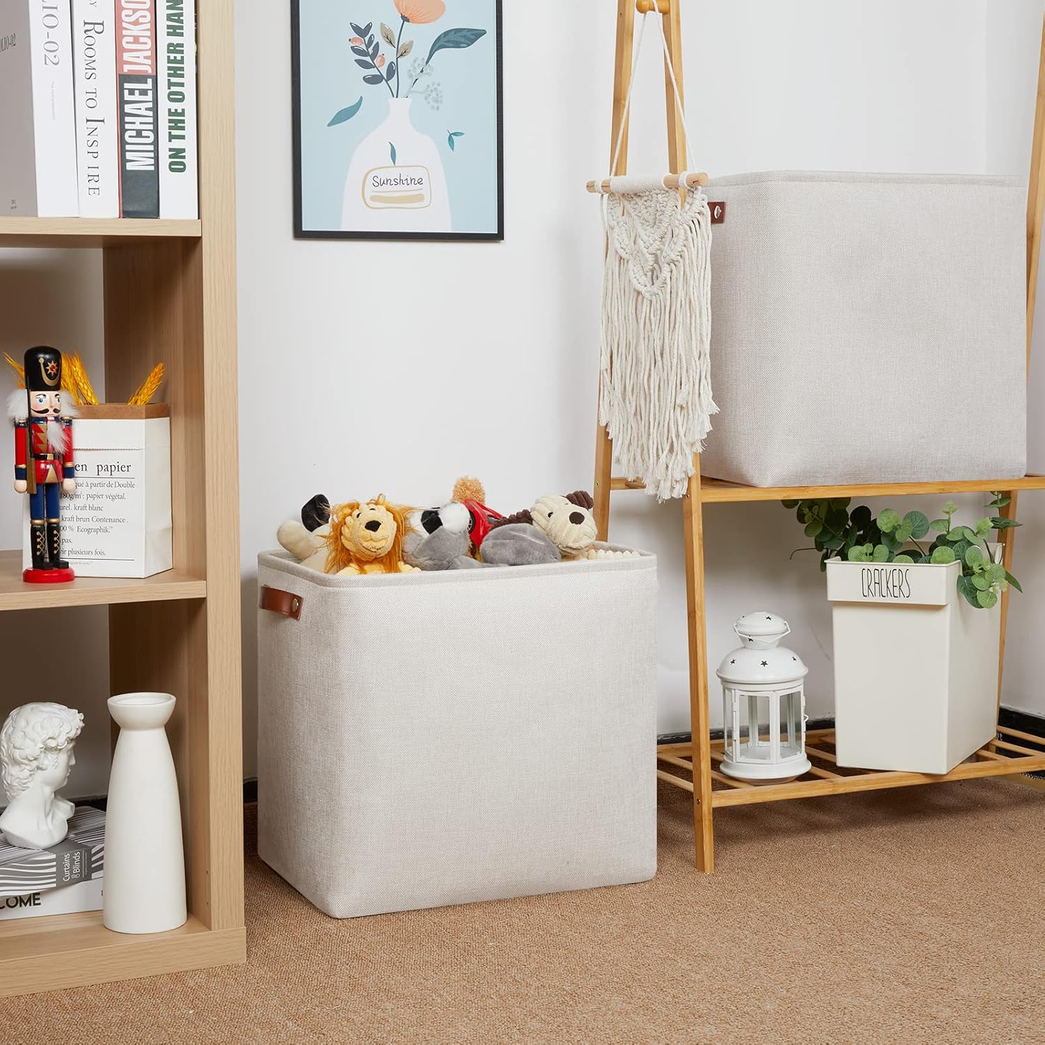 HNZIGE Collapsible Canvas Linen Storage Basket, Set of 2, Large Fabric Cloth Baskets, Rectangular Shelf Baskets with Leather Handles, Organizing Storage Baskets for Storage Closet, Home, Office(Gream)