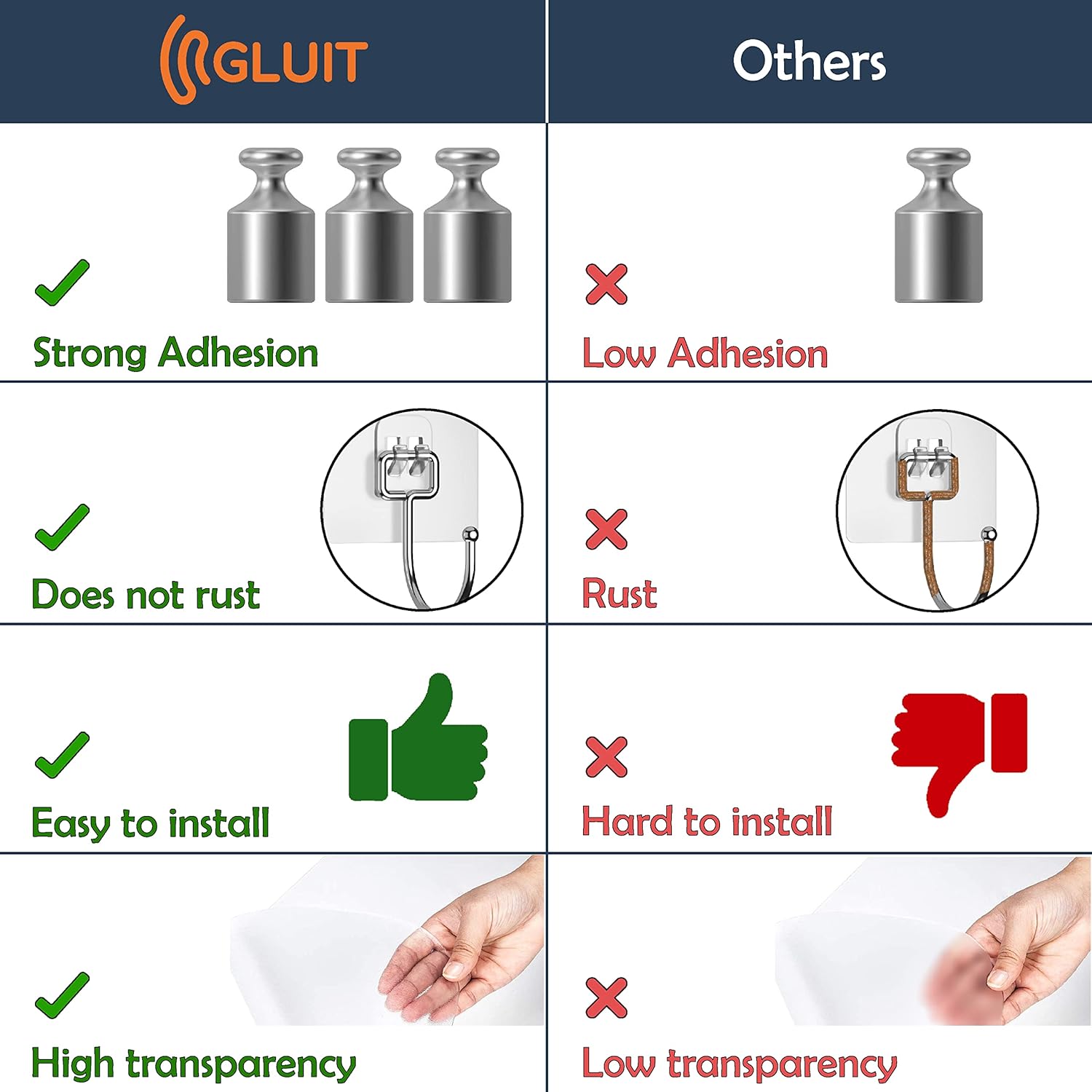 - Sticky wall hooks for hanging: Are crafted for walls in your office, garage, or workshop. Avoid using on painted walls. Their transparent design makes them nearly invisible on surfaces, making them ideal for tool organization, indoor and outdoor use.