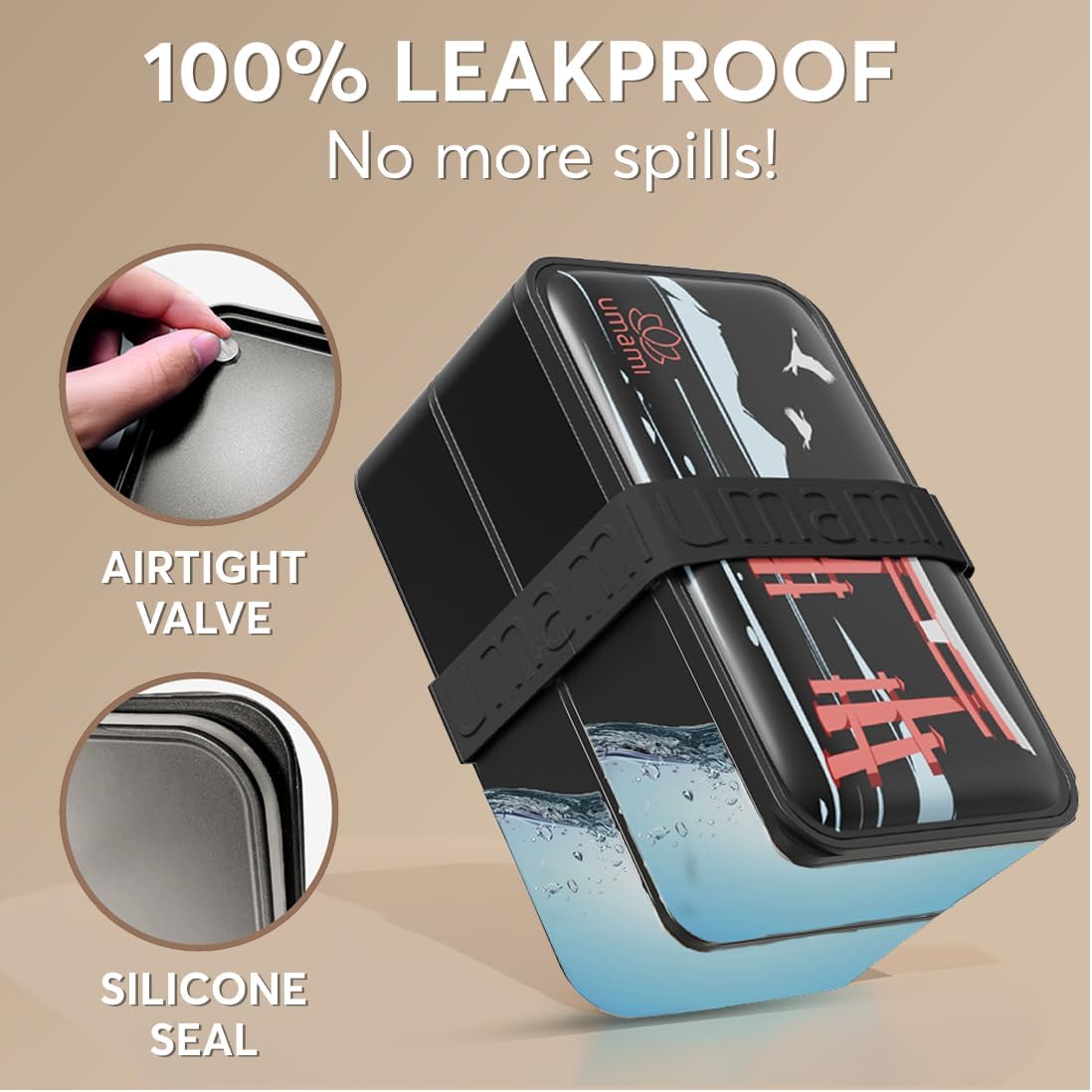 Umami Bento Box Adult All-In-1 w/4 Utensils, 2Sauce Jars, 2 Dividers, 100% Leakproof, Microwave & Dishwasher Safe, Stackable Bento Lunch Box Containers for Men/Women, Matte Black - Miyajima, 40 oz