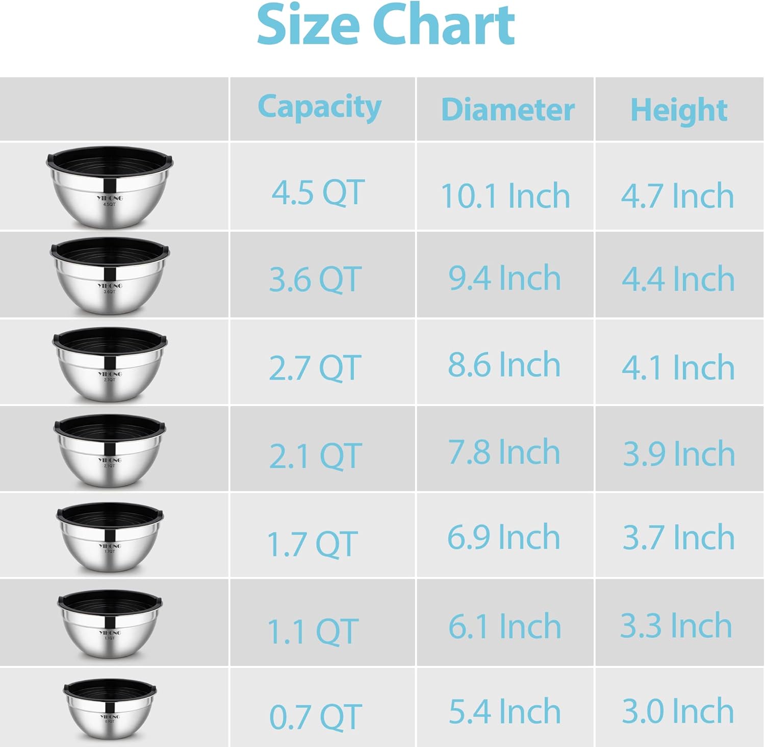 - Make Your Cooking Much Easier β Multi-purpose, stainless steel mixing bowl is essential to your everyday kitchen needs,7 different sizes of 4.5, 3.6, 2.7, 2.1, 1.7, 1.1, 0.7Qt will complement your cooking and make cooking much easier. Ideal for making a quick salad, preparing food, mixing batters, or storing and serving food.