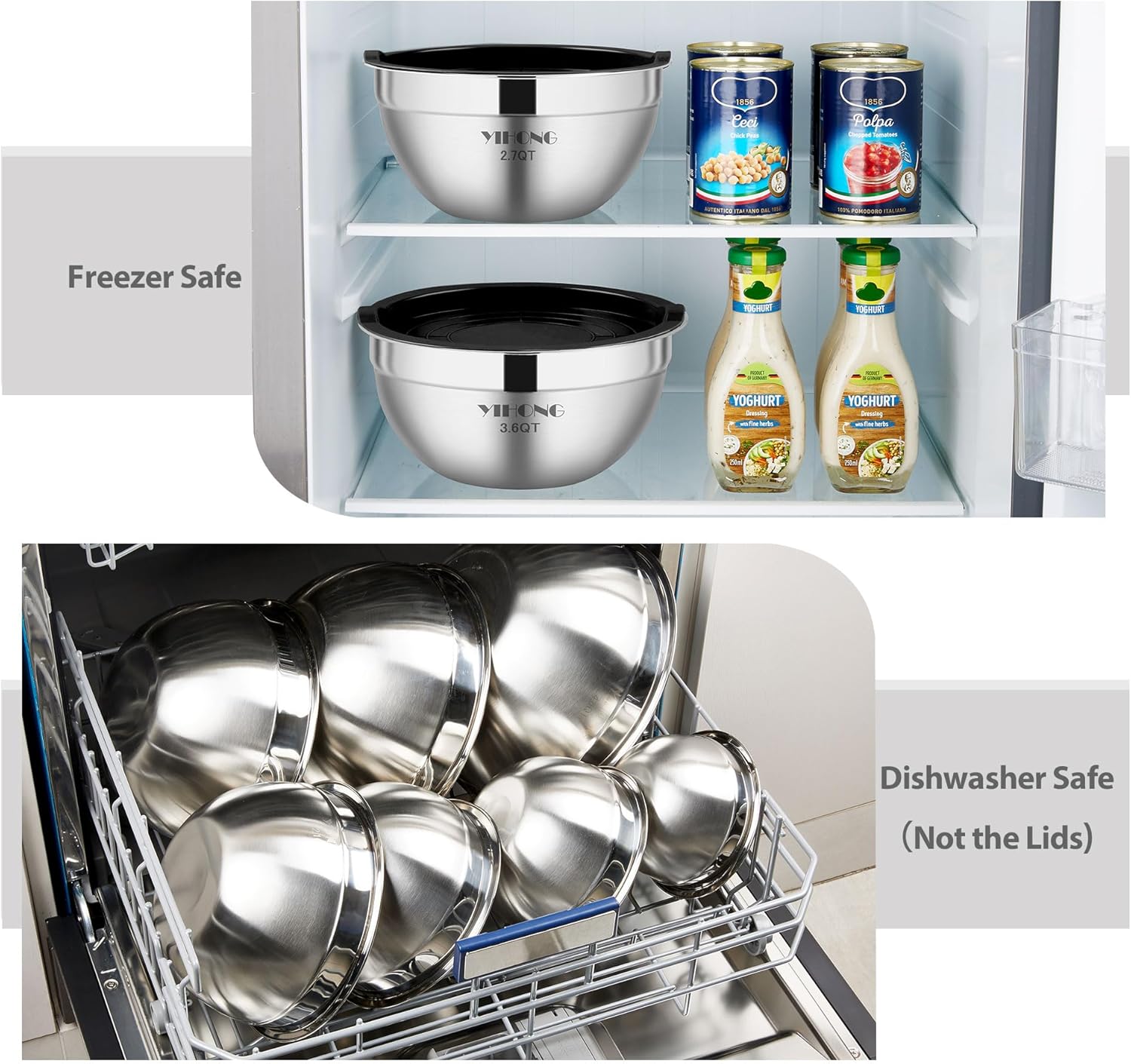 - Durable and High Quality β Made of high-quality stainless steel for lasting use, which is resistant and rustproof. These mixing bowls are dishwasher safe, more convenient for you and your family.