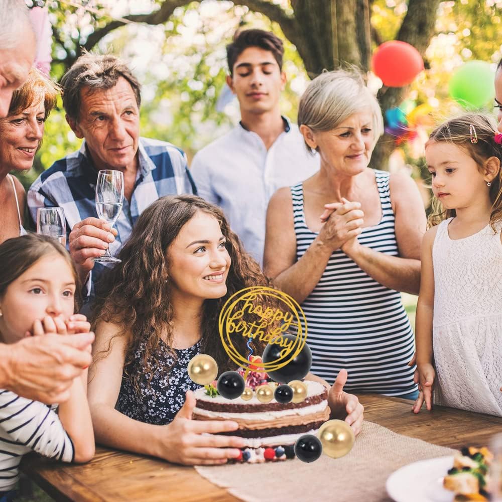 - PACKAGE: Package combines with 26 pcs balls with different sizes, black and gold, 2cm*12pcs, 2.5cm*8pcs, 3cm*4pcs, 4cm*2pcs and 1 pcs Happy Birthday cake topper.