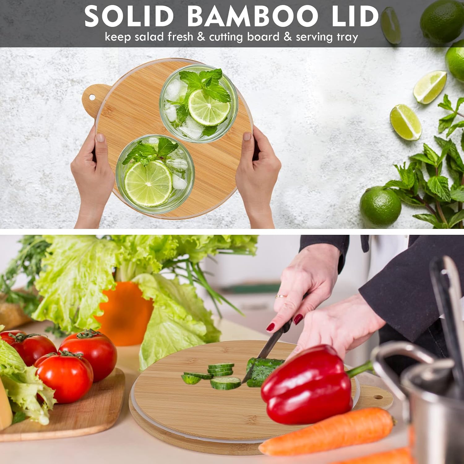 - 〖MULTIFUNCTIONAL AIRTIGHT LID〗: The solid bamboo lid can be used as chopping board for easy preparation. With upgrade design, it’s easier to pickup the utensils with extra ergonomic slot by the the grooves. And the tail of the lid makes the salad bowl easier to open. And there’s also a hole on the tail for hanging as your convenience.The silicone seal ring around will make the lid stay on the bowl, which makes the salad bowl portable for travelling, grab and go from home to work.