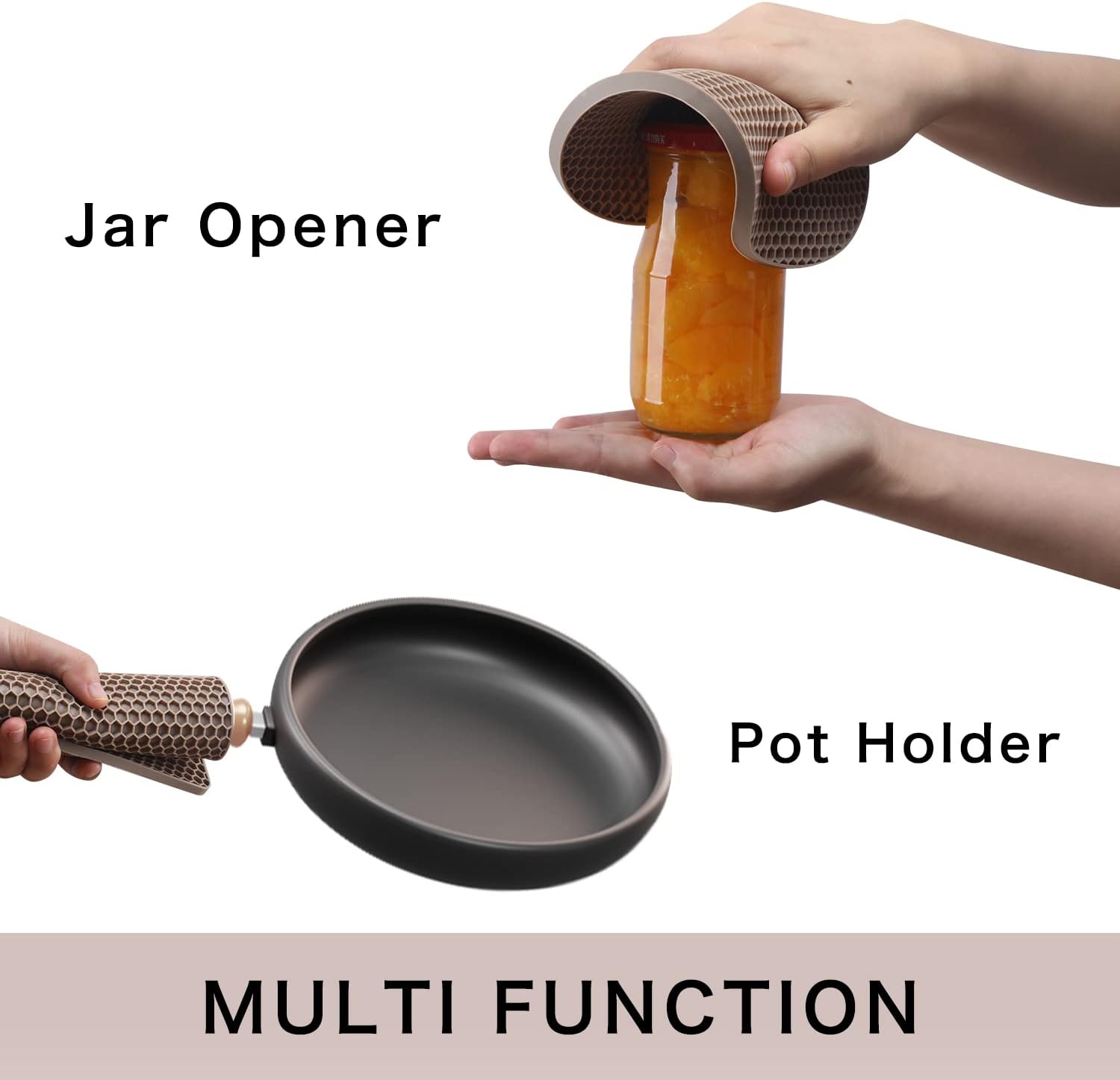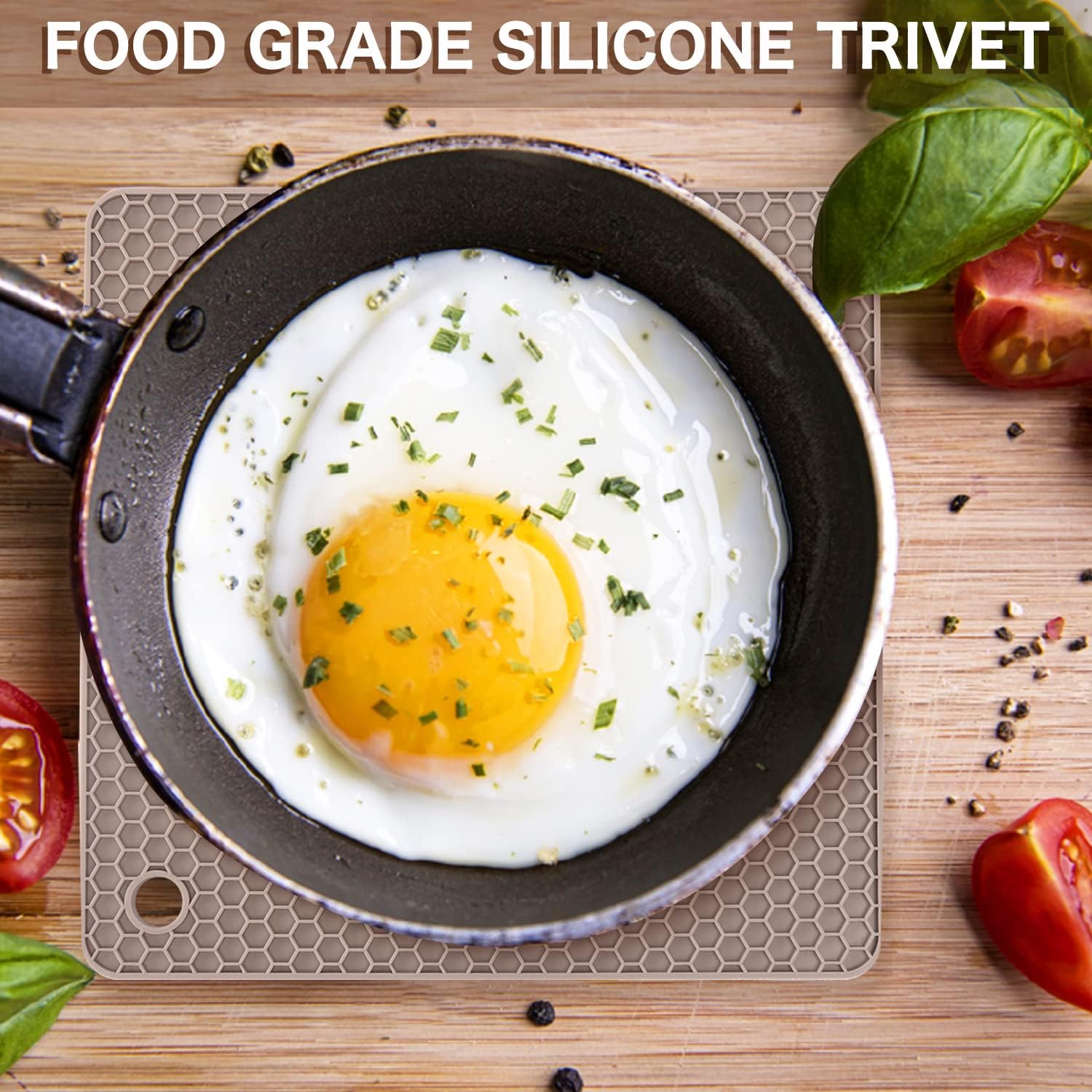- đŻăNONSLIP & FLEXIBLEăThe 4 pack almond kitchen trivets are soft and slip-resistant, helping us to get a comfortable grip while you cook; the double-side honeycomb pattern helps us hold tight to hot pans, pots, and baking sheets without hindering the natural grip. Also, the silicone hot pad is leakproof so that the cold or hot liquids wonât flow to the desktop.