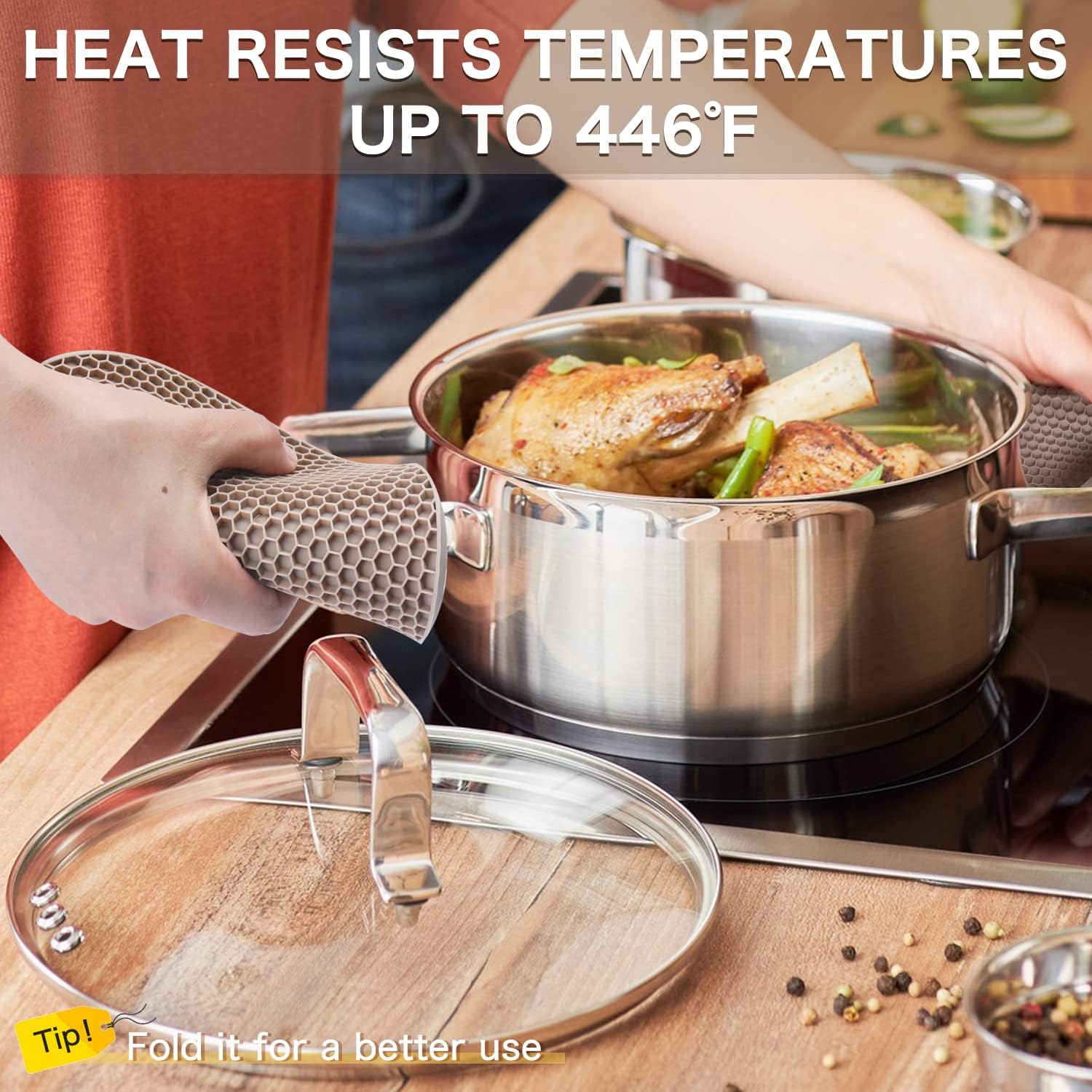 - đŻăHIGH HEAT RESISTANTăThese 4 pack silicone pot holders for kitchen heat resistant temperature is up to 446â (230â), effectively protecting the countertop and tabletop from the damage of heat marks, liquids, and scratches. Safe for use in an oven, microwave, dishwasher, or freezer.d silicone trivet is cyclic usable, safe, reliable, and environmental.