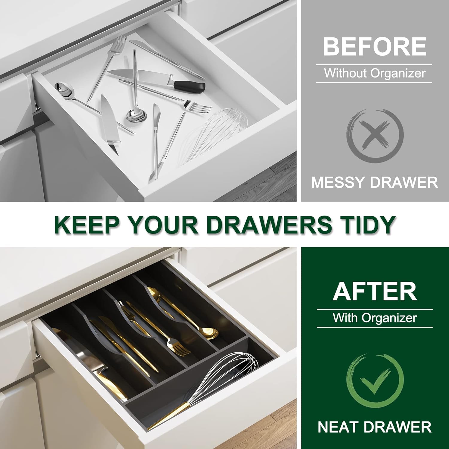 - ăKeep all you need at handăStop worrying about finding utensils when you cook. 5 deep compartments make our silverware organizer a good assistant for cooking. When all every cutlery is neatly arranged in our drawer cooking is also become easier. Clear your flatware & utensil and enjoy cooking with a cheerful heart.