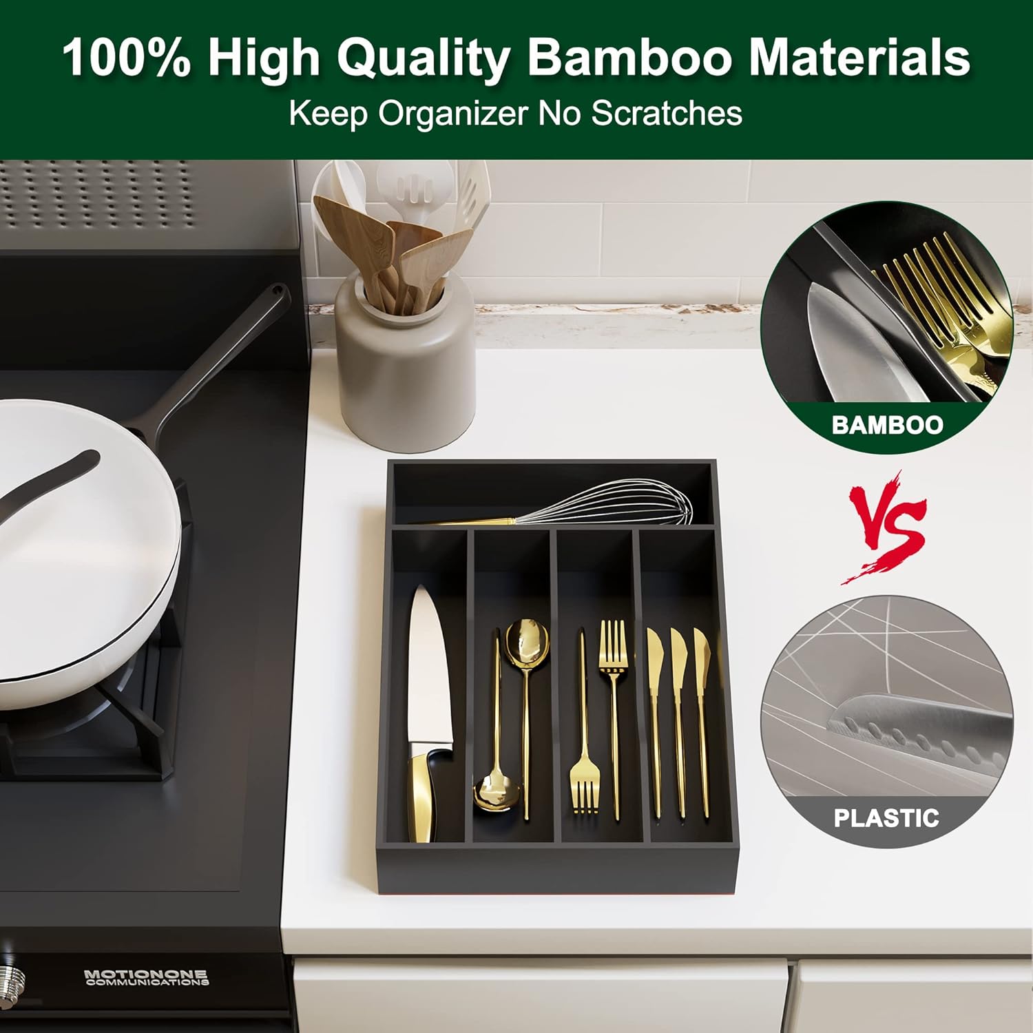 - ăMade of natural bambooăOur flatware organizer is made of natural bamboo. The material is taken from bamboo that have grown for more than 4 years which make our silverware holder for drawer use a durable kitchen piece that ll last you for years. The Environmentally material keep our flatware & utensil water and odor resistant. Even the knife won't leave scratch on it.