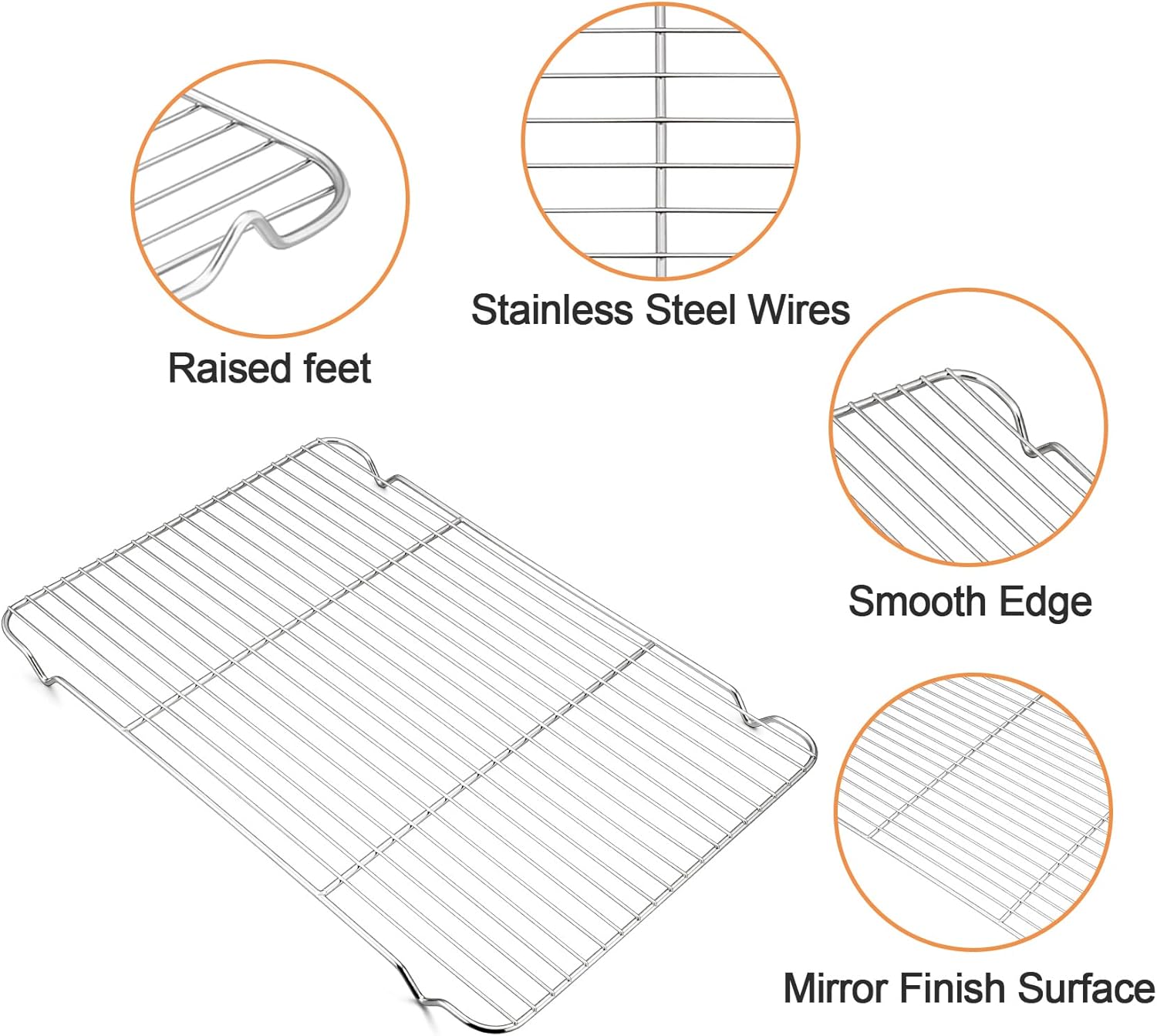 - 【STURDY COOLING RACKS】- The baking rack parallel wires welded firmly for holding more food, Dense wires to avoid food falling through, 4 raised feet to lift the food up and help hot air flow circularly to bake quickly and evenly, Great assistant for baking crispy stuff