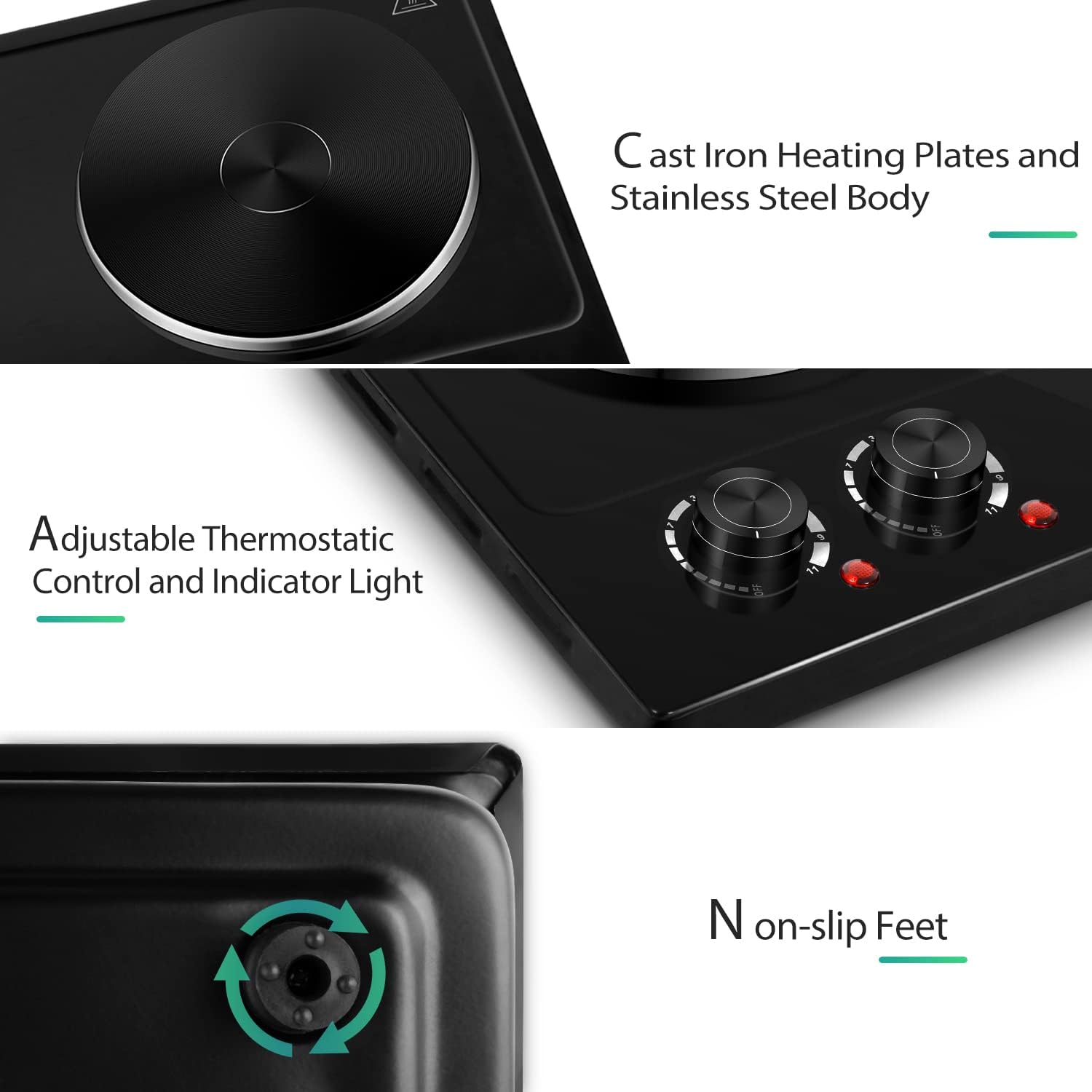 - [Cast-Iron Burners & Easy Cooking]-Turn on/off the burner by just turning the knob, easy operating. This hot plate is equipped with thermostat, when it reaches the setting temperature, it will automatically cycle on/off the power to maintain the setting temperature. Easy cooking. Great for every day use or as an extra cooking appliance in a busy kitchen. No stovetop required.