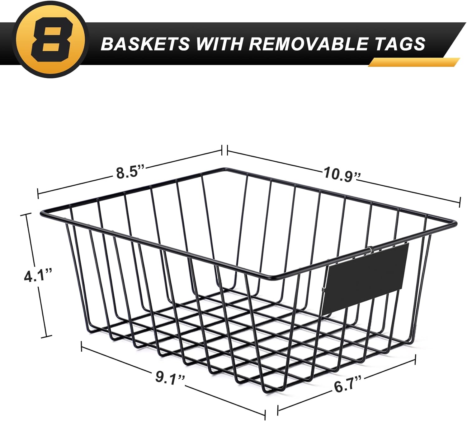 8 Pack Wire Storage Baskets for Organizing with Removable Tags, Pantry Organization Bins for Kitchen Cabinets, Closet - Metal Basket for Laundry, Garage, Refridge, Bathroom Countertop Organizer, Black