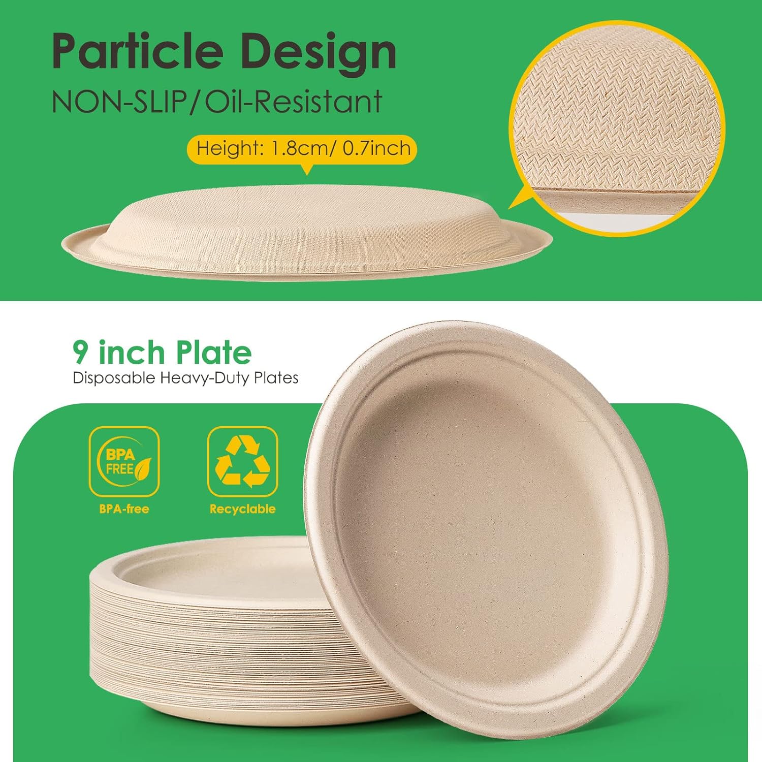 - 【Sturdy and Durable】These compostable plates 100% tree-free. No plastic or wax lining, unbleached, dye-free, gluten-free, BPA-free, cut, and oil resistant. Great for serving hot or cold